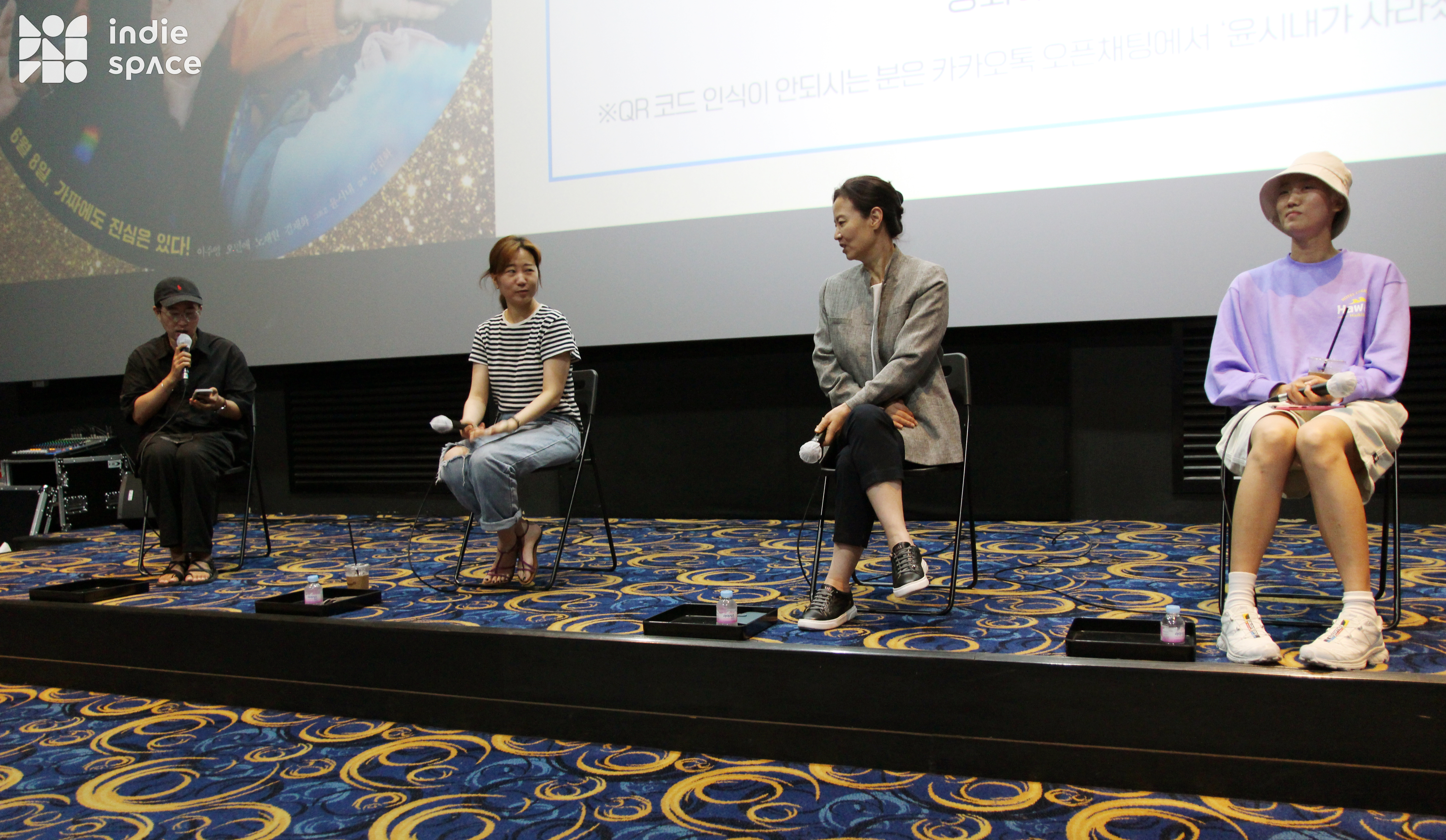 진명현: 이따 질문을 직접 해 주셔도 좋아하실 것 같은데요? 오픈 채팅방을 통해서 오늘 GV가 진행됩니다. 이야기를 올려 주시면 제가 최대한 많이 감독님과 배우님들께 여쭙도록 하겠습니다. 저는 이 작품을 전주국제영화제에서 먼저 봤습니다. 그때 저와 무대인사를 함께 했는데 굉장히 텐션이 높은 상태였어요. 노재원 배우님께서 함께 이주영 배우님 유튜브 촬영하는 것처럼 폰으로 관객분들을 찍기도 하시고. 굉장히 신이 난 상태로 강풍이 부는 가운데 무대인사를 진행했습니다. 그때 에너지가 엄청난 영화였다고 기억하고 있는데 오늘 다시 극장에서 보니까 또 다른 느낌이 많이 들더라고요. 오늘은 이주영 배우님이 계속 눈에 밟히더라고요. 이 영화가 되게 즐거운 음악 영화이기도 하고, 확신의 모녀 서사잖아요. 오늘 보신 분들도 재관람을 하시면 또 다른 캐릭터에 이입을 할 수 있을 거라 생각합니다. 아마 많은 분들이 궁금해하실 텐데, 윤시내를 TV에서 보신 분들과 그렇지 않은 분들, 연령대가 좀 다를 것 같아요. 제가 감독님을 잘 알지 못하지만, 윤시내를 보면서 열광했던 세대는 아닐 거라고 짐작이 되거든요. 그래서 이 영화가 어떻게 감독님 품 안에서 태어나게 되었는지 이야기를 듣고 싶습니다.