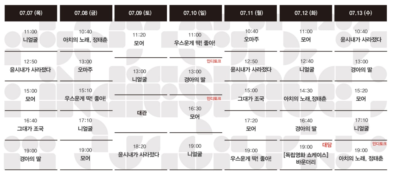 Now Playing/상영시간표 [07.07-07.13 상영시간표] 모어 / 니얼굴 / 우스운 게 딱! 좋아! / 경아의 딸 / 윤시내가 사라졌다 / 오마주 / 그대가 조국 / 아치의 노래, 정태춘 by indiespace_은 2022. 7. 1. [클릭] 공유하기 게시글 관리 인디스페이스 indiespace 저작자표시 (새창열림) 'Now Playing > 상영시간표' 카테고리의 다른 글 [07.21-07.27 상영시간표] 아이를 위한 아이 / 모어 / 니얼굴 / 우스운 게 딱! 좋아! / 경아의 딸 / 윤시내가 사라졌다 / 아치의 노래, 정태춘 (0) 2022.07.14 [07.14-07.20 상영시간표] 모어 / 니얼굴 / 우스운 게 딱! 좋아! / 경아의 딸 / 윤시내가 사라졌다 / 오마주 / 그대가 조국 / 아치의 노래, 정태춘 (0) 2022.07.07 [06.30-07.06 상영시간표] 모어 / 니얼굴 / 우스운 게 딱! 좋아! / 경아의 딸 / 윤시내가 사라졌다 / 오마주 / 그대가 조국 / 아치의 노래, 정태춘 (0) 2022.06.24 [06.23-06.29 상영시간표] 모어 / 니얼굴 / 우스운 게 딱! 좋아! / 경아의 딸 / 윤시내가 사라졌다 / 오마주 / 그대가 조국 / 아치의 노래, 정태춘 (0) 2022.06.17 [06.16-06.22 상영시간표] 경아의 딸 / 윤시내가 사라졌다 / 괴물, 유령, 자유인 / 오마주 / 그대가 조국 / 봉명주공 / 아치의 노래, 정태춘 (0) 2022.06.09 관련글 [07.21-07.27 상영시간표] 아이를 위한 아이 / 모어 / 니얼굴 / 우스운 게 딱! 좋아! / 경아의 딸 / 윤시내가 사라졌다 / 아치의 노래, 정태춘 [07.14-07.20 상영시간표] 모어 / 니얼굴 / 우스운 게 딱! 좋아! / 경아의 딸 / 윤시내가 사라졌다 / 오마주 / 그대가 조국 / 아치의 노래, 정태춘 [06.30-07.06 상영시간표] 모어 / 니얼굴 / 우스운 게 딱! 좋아! / 경아의 딸 / 윤시내가 사라졌다 / 오마주 / 그대가 조국 / 아치의 노래, 정태춘 [06.23-06.29 상영시간표] 모어 / 니얼굴 / 우스운 게 딱! 좋아! / 경아의 딸 / 윤시내가 사라졌다 / 오마주 / 그대가 조국 / 아치의 노래, 정태춘 댓글