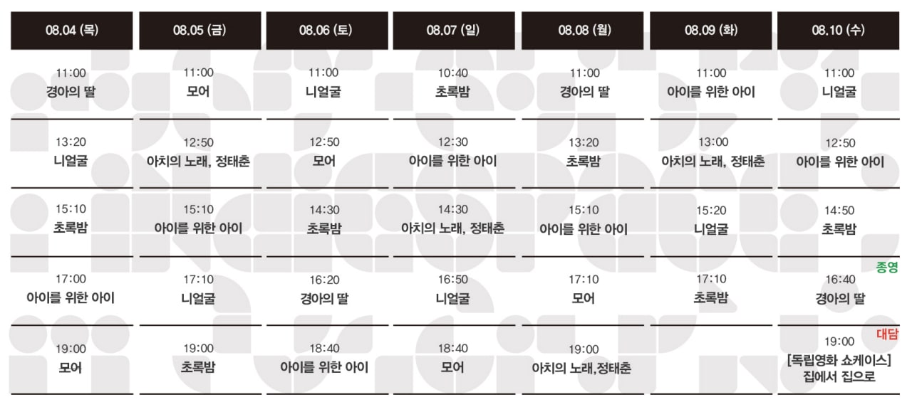 Now Playing/상영시간표 [08.04-08.10 상영시간표] 초록밤 / 아이를 위한 아이 / 모어 / 니얼굴 / 경아의 딸 / 아치의 노래, 정태춘 by indiespace_은 2022. 7. 28. [클릭] 공유하기 게시글 관리 인디스페이스 indiespace 저작자표시 (새창열림) 'Now Playing > 상영시간표' 카테고리의 다른 글 [08.18-08.24 상영시간표] 파로호 / 녹턴 / 모퉁이 / 초록밤 / 모어 / 니얼굴 / 아치의 노래, 정태춘 (0) 2022.08.11 [08.11-08.17 상영시간표] 모퉁이 / 초록밤 / 아이를 위한 아이 / 모어 / 니얼굴 / 아치의 노래, 정태춘 (0) 2022.08.05 [07.28-08.03 상영시간표] 초록밤 / 아이를 위한 아이 / 모어 / 니얼굴 / 우스운 게 딱! 좋아! / 경아의 딸 / 아치의 노래, 정태춘 (0) 2022.07.22 [07.21-07.27 상영시간표] 아이를 위한 아이 / 모어 / 니얼굴 / 우스운 게 딱! 좋아! / 경아의 딸 / 윤시내가 사라졌다 / 아치의 노래, 정태춘 (0) 2022.07.14 [07.14-07.20 상영시간표] 모어 / 니얼굴 / 우스운 게 딱! 좋아! / 경아의 딸 / 윤시내가 사라졌다 / 오마주 / 그대가 조국 / 아치의 노래, 정태춘 (0) 2022.07.07 관련글 [08.18-08.24 상영시간표] 파로호 / 녹턴 / 모퉁이 / 초록밤 / 모어 / 니얼굴 / 아치의 노래, 정태춘 [08.11-08.17 상영시간표] 모퉁이 / 초록밤 / 아이를 위한 아이 / 모어 / 니얼굴 / 아치의 노래, 정태춘 [07.28-08.03 상영시간표] 초록밤 / 아이를 위한 아이 / 모어 / 니얼굴 / 우스운 게 딱! 좋아! / 경아의 딸 / 아치의 노래, 정태춘 [07.21-07.27 상영시간표] 아이를 위한 아이 / 모어 / 니얼굴 / 우스운 게 딱! 좋아! / 경아의 딸 / 윤시내가 사라졌다 / 아치의 노래, 정태춘 댓글