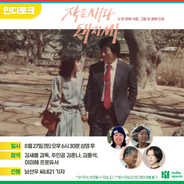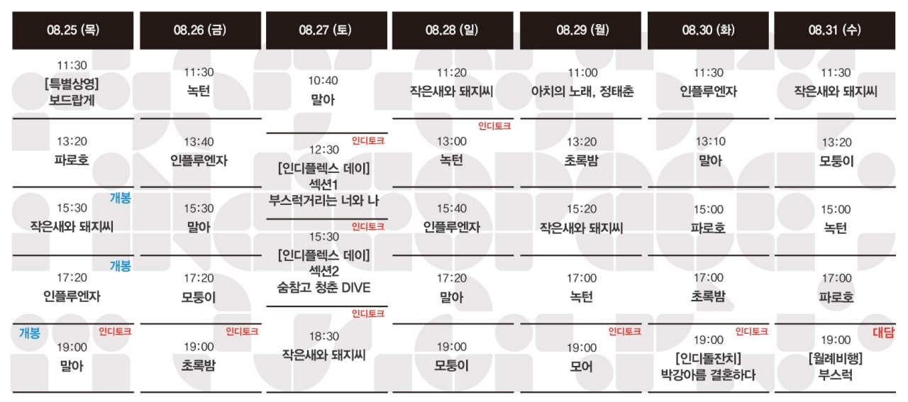 Now Playing/상영시간표 [08.25-08.31 상영시간표] 말아 / 인플루엔자 / 작은새와 돼지씨 / 파로호 / 녹턴 / 모퉁이 / 초록밤 / 모어 / 아치의 노래, 정태춘 by indiespace_은 2022. 8. 18. [클릭] 공유하기 게시글 관리 인디스페이스 indiespace 저작자표시 (새창열림) 'Now Playing > 상영시간표' 카테고리의 다른 글 [09.08-09.14 상영시간표] 성적표의 김민영 / 말아 / 인플루엔자 / 작은새와 돼지씨 / 파로호 / 녹턴 / 모퉁이 (0) 2022.09.01 [09.01-09.07 상영시간표] 성적표의 김민영 / 말아 / 인플루엔자 / 작은새와 돼지씨 / 파로호 / 녹턴 / 모퉁이 / 초록밤 / 아치의 노래, 정태춘 (0) 2022.08.25 [08.18-08.24 상영시간표] 파로호 / 녹턴 / 모퉁이 / 초록밤 / 모어 / 니얼굴 / 아치의 노래, 정태춘 (0) 2022.08.11 [08.11-08.17 상영시간표] 모퉁이 / 초록밤 / 아이를 위한 아이 / 모어 / 니얼굴 / 아치의 노래, 정태춘 (0) 2022.08.05 [08.04-08.10 상영시간표] 초록밤 / 아이를 위한 아이 / 모어 / 니얼굴 / 경아의 딸 / 아치의 노래, 정태춘 (0) 2022.07.28 관련글 [09.08-09.14 상영시간표] 성적표의 김민영 / 말아 / 인플루엔자 / 작은새와 돼지씨 / 파로호 / 녹턴 / 모퉁이 [09.01-09.07 상영시간표] 성적표의 김민영 / 말아 / 인플루엔자 / 작은새와 돼지씨 / 파로호 / 녹턴 / 모퉁이 / 초록밤 / 아치의 노래, 정태춘 [08.18-08.24 상영시간표] 파로호 / 녹턴 / 모퉁이 / 초록밤 / 모어 / 니얼굴 / 아치의 노래, 정태춘 [08.11-08.17 상영시간표] 모퉁이 / 초록밤 / 아이를 위한 아이 / 모어 / 니얼굴 / 아치의 노래, 정태춘 댓글