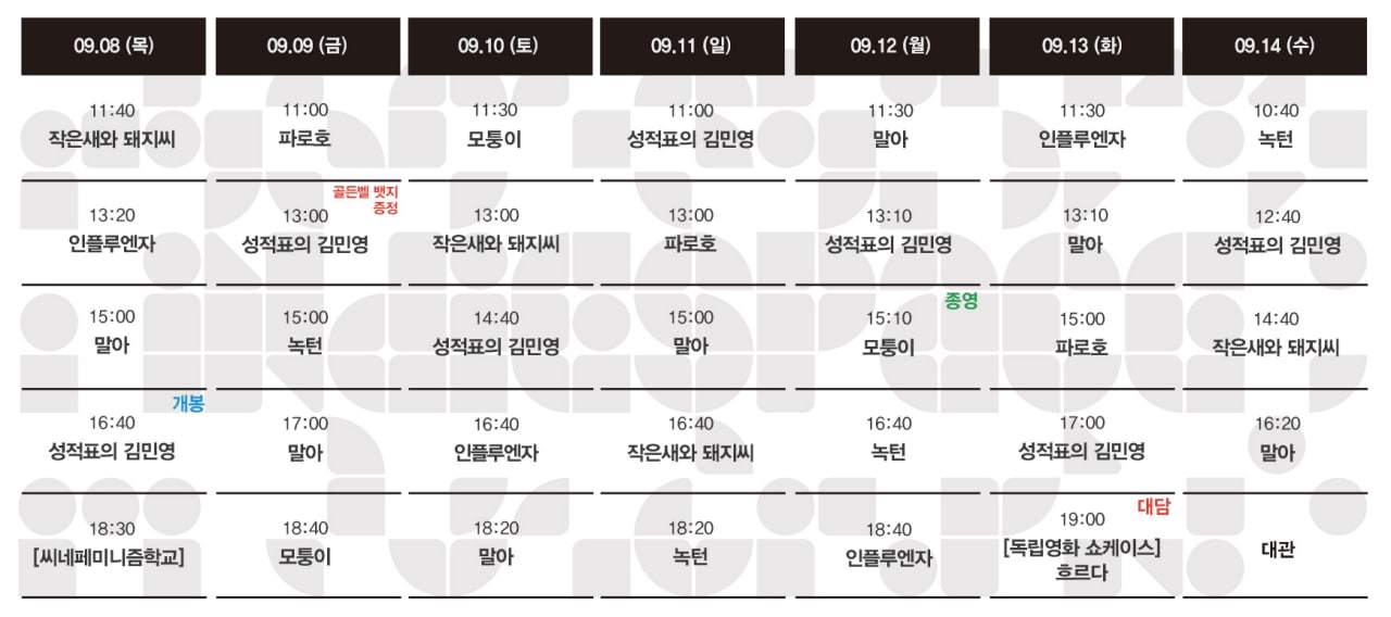 Now Playing/상영시간표 [09.08-09.14 상영시간표] 성적표의 김민영 / 말아 / 인플루엔자 / 작은새와 돼지씨 / 파로호 / 녹턴 / 모퉁이 by indiespace_은 2022. 9. 1. [클릭] 공유하기 게시글 관리 인디스페이스 indiespace 저작자표시 (새창열림) 'Now Playing > 상영시간표' 카테고리의 다른 글 [09.22-09.28 상영시간표] 썬더버드 / 달이 지는 밤 / 지금, 이대로가 좋아요 / 기기묘묘 / 홈리스 / 둠둠 / 성적표의 김민영 / 말아 (0) 2022.09.19 [09.15-09.21 상영시간표] 홈리스 / 둠둠 / 성적표의 김민영 / 말아 / 인플루엔자 / 작은새와 돼지씨 / 파로호 / 녹턴 (0) 2022.09.08 [09.01-09.07 상영시간표] 성적표의 김민영 / 말아 / 인플루엔자 / 작은새와 돼지씨 / 파로호 / 녹턴 / 모퉁이 / 초록밤 / 아치의 노래, 정태춘 (0) 2022.08.25 [08.25-08.31 상영시간표] 말아 / 인플루엔자 / 작은새와 돼지씨 / 파로호 / 녹턴 / 모퉁이 / 초록밤 / 모어 / 아치의 노래, 정태춘 (0) 2022.08.18 [08.18-08.24 상영시간표] 파로호 / 녹턴 / 모퉁이 / 초록밤 / 모어 / 니얼굴 / 아치의 노래, 정태춘 (0) 2022.08.11 관련글 [09.22-09.28 상영시간표] 썬더버드 / 달이 지는 밤 / 지금, 이대로가 좋아요 / 기기묘묘 / 홈리스 / 둠둠 / 성적표의 김민영 / 말아 [09.15-09.21 상영시간표] 홈리스 / 둠둠 / 성적표의 김민영 / 말아 / 인플루엔자 / 작은새와 돼지씨 / 파로호 / 녹턴 [09.01-09.07 상영시간표] 성적표의 김민영 / 말아 / 인플루엔자 / 작은새와 돼지씨 / 파로호 / 녹턴 / 모퉁이 / 초록밤 / 아치의 노래, 정태춘 [08.25-08.31 상영시간표] 말아 / 인플루엔자 / 작은새와 돼지씨 / 파로호 / 녹턴 / 모퉁이 / 초록밤 / 모어 / 아치의 노래, 정태춘 댓글
