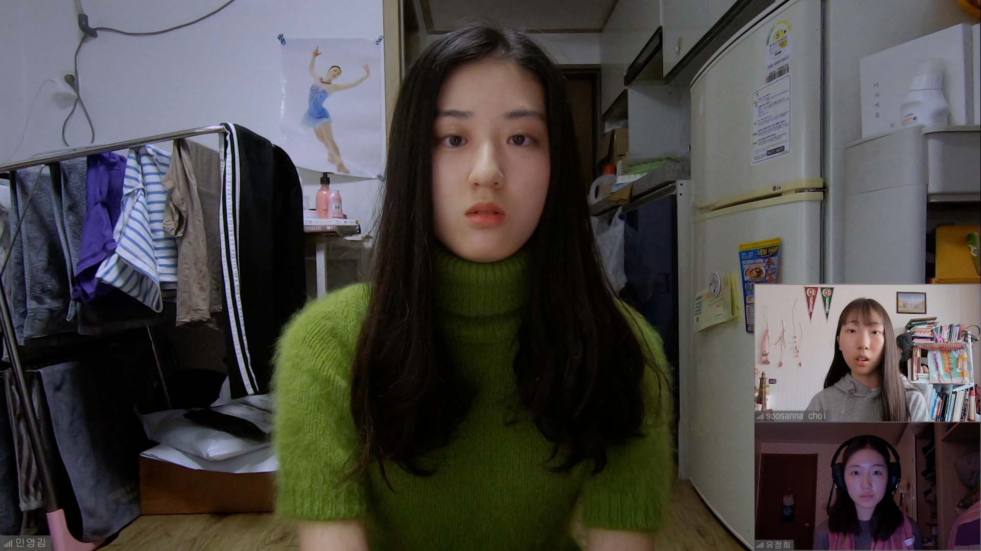 임지선: 누구나 불평을 얘기할 때는 그 안에 자기 모습도 반영이 된다고 생각을 했고. 민영이가 동기들이나 대학 사람들을 욕할 때 되게 가식적이고 눈치 많이 본다, 답답하다는 얘기를 하는데 분명 자기 자신에 대한 답답함을 토로하는 것도 있을 거라고 생각하고 정희도 그렇게 들었을 거라고 생각해요. 그래서 민영의 예민함이 정점에 가 있을 때 가장 한국인스럽지 않은 영삼이 시트콤 얘기도 해주고, 마지막에 이런 스트레스에서 네가 좀 해방됐으면 좋겠다는 의미를 담은 정희 식의 위로라고 생각했어요. 말씀해 주신 것처럼 이 영화가 굉장히 사적인 친구 간의 이야기를 다루지만 그런 키워드를 통해서 거창하지는 않지만 조금은 확장됐으면 좋겠다는 의도도 있었어요.