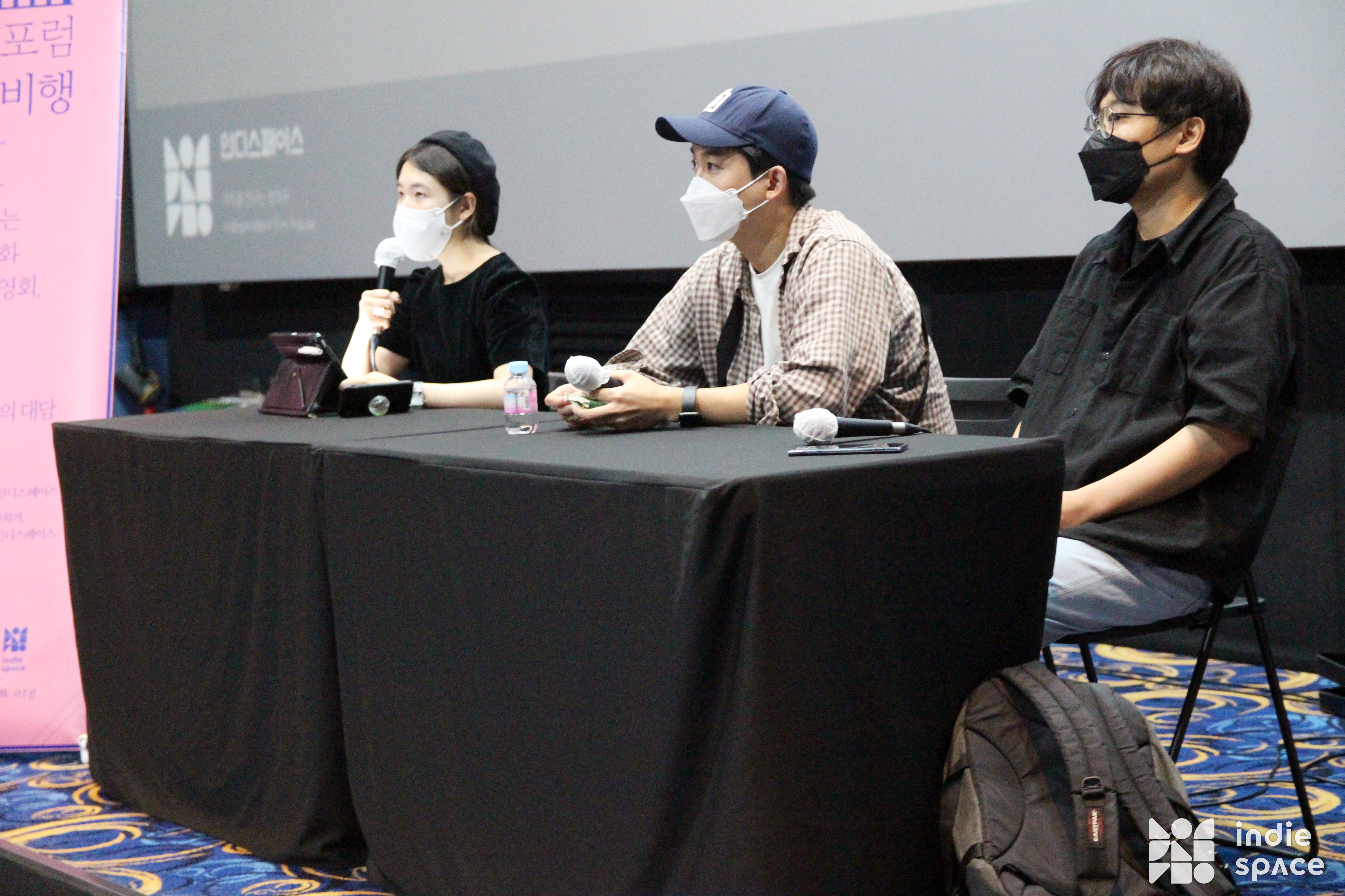 최이다: 네, 그래서 오늘 여러분이 보신 버전은 티빙에서 보신 메이킹 버전과 또 다르다는 걸 아실 것 같은데요. 제가 인상깊게 봤던 부분은 메이킹 영상을 티빙에서 볼 때는 메이킹 영상으로 따로 편집된 영상을 직접 보여줬다면 오늘 상영한 확장판에서는 메이킹 영상을 보는 패널들이 함께 나오더라고요. 그러니까 메이킹 영상이 스크린에 틀어져 있고 화면 하단에 프로그램 패널들이 앉은 뒷모습이 보이는 상태인 거죠. 그래서 메이킹 영상에 관한 메이킹 영상이 되었는데, 이런 확장판을 만드는 데 있어서 편집 방향이라든지 이런 게 궁금했습니다. 자막도 없고요. 어떻게 보면 티빙에 공개되지 않은 대화를 거의 풀버전으로 들은 것이거든요. 그래서 인디포럼 상영본을 만드실 때 티빙과는 다른 어떤 방향성을 취하셨는지 얘기를 듣고 싶습니다.