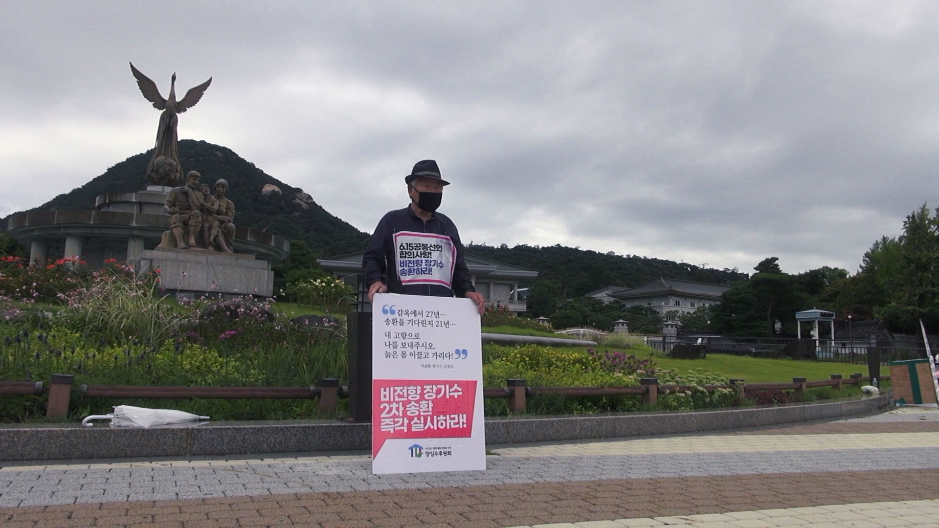 김동원: 계기라는 걸 행운이라는 말로 대체할 수도 있을 것 같은데요. 송환이라는 사건이 없었다면 90년대 초부터 찍었던 영상들이 아무 쓸모없이 그냥 버려졌을 수도 있어요. 그런데 마침 2000년에 송환이 이루어지고 〈송환〉이라는 작품도 마칠 수 있게 되어서 선생님들한테도 큰 행운이었고 저한테도 큰 행운이었어요. 반면 이번 〈2차 송환〉은 그런 계기가 저한테도 없었고 선생님들한테도 없었고. 끝낼 계기를 갖지 못한 채 작품을 만들어야 했기 때문에 고생을 좀 많이 했어요. 사실 문재인 대통령 때 송환이 될 거라는 기대가 컸고 그렇게 끝낼 수 있겠다는 기대를 했었거든요. 근데 하노이 회담의 결렬로 그게 무산되니까 끝을 어떻게 내야 할지 막막하더라고요. 29년 기념식 장면에서 보셨듯이 종합추진위원회도 점점 힘을 잃어가고, 저도 그렇고요. 그렇게 고민하던 중 2021년 9월 2일 송환 21주기 기념일에 김영식 선생님 혼자서 청와대 앞에서 1인 시위를 하셨어요. 뭐 별다른 의미를 못 두고 습관적으로 찍었는데, 찍으면서 보니까 '아, 이게 마지막 장면이 될 수도 있겠구나'라는 생각이 들었습니다. 그걸 마지막에 두고서 앞에 얘기들을 정리하게 됐죠. 이게 계기라면 계기인 것 같아요.
