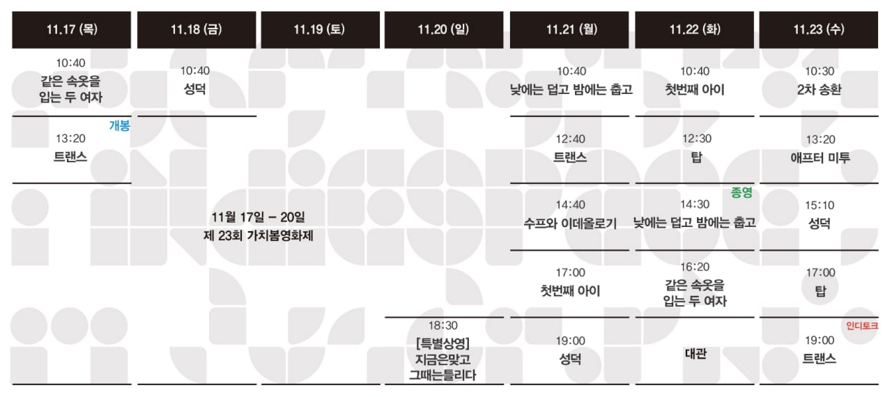 Now Playing/상영시간표 [11.17-11.23 상영시간표] 트랜스 / 같은 속옷을 입는 두 여자 / 첫번째 아이 / 탑 / 낮에는 덥고 밤에는 춥고 / 수프와 이데올로기 / 애프터 미투 / 성덕 / 2차 송환 by indiespace_은 2022. 11. 10. [클릭] 공유하기 게시글 관리 인디스페이스 indiespace 저작자표시 (새창열림) 'Now Playing > 상영시간표' 카테고리의 다른 글 [12.01-12.07 상영시간표] 그 겨울, 나는 / 만인의 연인 / 요정 / 우수 / 창밖은 겨울 / 트랜스 / 같은 속옷을 입는 두 여자 / 첫번째 아이 / 탑 / 수프와 이데올로기 / 2차 송환 (0) 2022.11.25 [11.24-11.30 상영시간표] 창밖은 겨울 / 우수 / 트랜스 / 같은 속옷을 입는 두 여자 / 첫번째 아이 / 탑 / 수프와 이데올로기 / 애프터 미투 / 성덕 / 2차 송환 (0) 2022.11.17 [11.10-11.16 상영시간표] 같은 속옷을 입는 두 여자 / 첫번째 아이 / 탑 / 낮에는 덥고 밤에는 춥고 / 수프와 이데올로기 / 낮과 달 / 애프터 미투 / 성덕 / 2차 송환 (0) 2022.11.04 [11.03-11.09 상영시간표] 낮에는 덥고 밤에는 춥고 / 수프와 이데올로기 / 낮과 달 / 선데이리그 / 애프터 미투 / 태안 / 성덕 / 물방울을 그리는 남자 / 2차 송환 (0) 2022.10.28 [10.27-11.02 상영시간표] 낮에는 덥고 밤에는 춥고 / 수프와 이데올로기 / 낮과 달 / 선데이리그 / 애프터 미투 / 태안 / 성덕 / 물방울을 그리는 남자 / 2차 송환 (0) 2022.10.20 관련글 [12.01-12.07 상영시간표] 그 겨울, 나는 / 만인의 연인 / 요정 / 우수 / 창밖은 겨울 / 트랜스 / 같은 속옷을 입는 두 여자 / 첫번째 아이 / 탑 / 수프와 이데올로기 / 2차 송환 [11.24-11.30 상영시간표] 창밖은 겨울 / 우수 / 트랜스 / 같은 속옷을 입는 두 여자 / 첫번째 아이 / 탑 / 수프와 이데올로기 / 애프터 미투 / 성덕 / 2차 송환 [11.10-11.16 상영시간표] 같은 속옷을 입는 두 여자 / 첫번째 아이 / 탑 / 낮에는 덥고 밤에는 춥고 / 수프와 이데올로기 / 낮과 달 / 애프터 미투 / 성덕 / 2차 송환 [11.03-11.09 상영시간표] 낮에는 덥고 밤에는 춥고 / 수프와 이데올로기 / 낮과 달 / 선데이리그 / 애프터 미투 / 태안 / 성덕 / 물방울을 그리는 남자 / 2차 송환 댓글