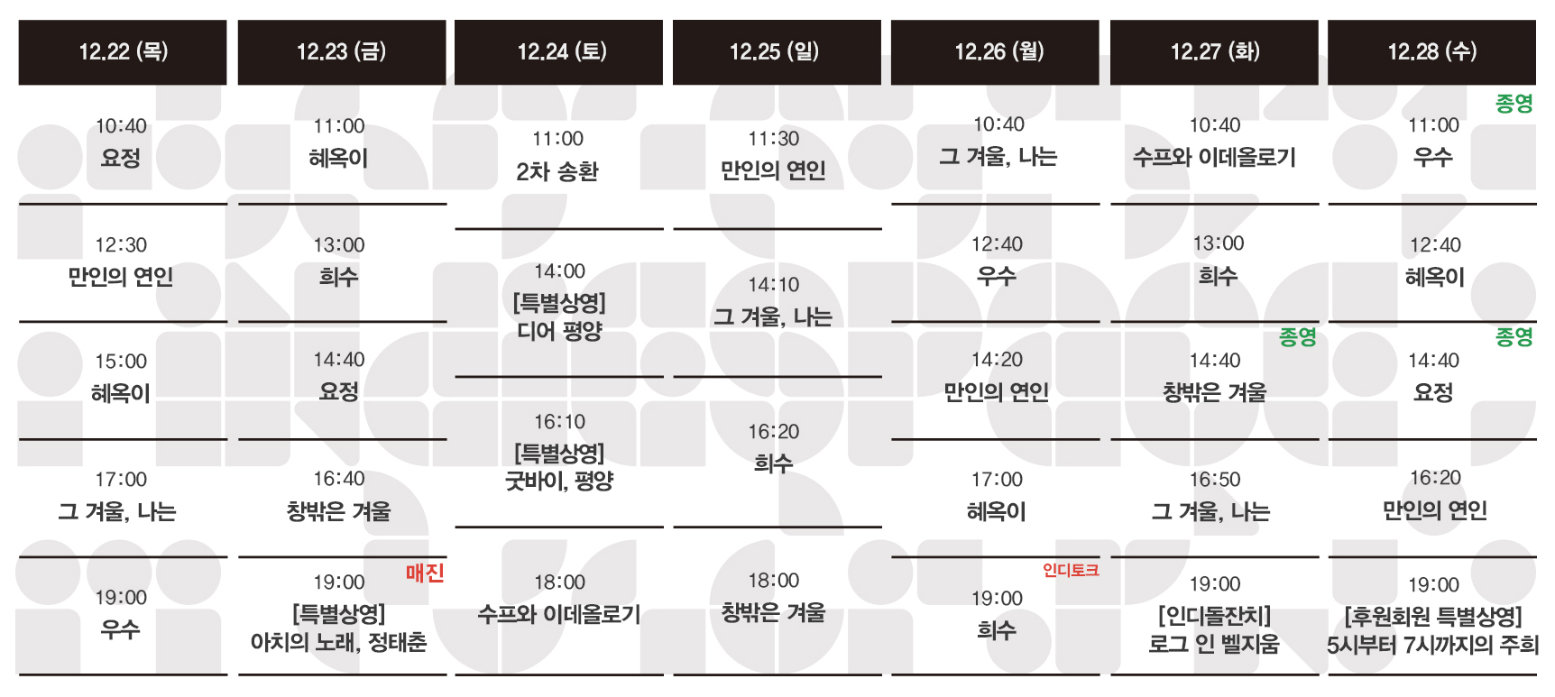 Now Playing/상영시간표 [12.22-12.28 상영시간표] 희수 / 혜옥이 / 만인의 연인 / 요정 / 그 겨울, 나는 / 우수 / 창밖은 겨울 / 수프와 이데올로기 / 2차 송환 by indiespace_은 2022. 12. 15. [클릭] 공유하기 게시글 관리 인디스페이스 indiespace 저작자표시 (새창열림) 'Now Playing > 상영시간표' 카테고리의 다른 글 [01.05-01.11 상영시간표] 시간을 꿈꾸는 소녀 / 희망의 요소 / 라스트 필름 / 희수 / 혜옥이 / 만인의 연인 / 그 겨울, 나는 / 수프와 이데올로기 / 2차 송환 (0) 2022.12.29 [12.29-01.04 상영시간표] 희망의 요소 / 라스트 필름 / 희수 / 혜옥이 / 만인의 연인 / 그 겨울, 나는 / 수프와 이데올로기 / 2차 송환 (0) 2022.12.23 [12.15-12.21 상영시간표] 희수 / 혜옥이 / 만인의 연인 / 요정 / 그 겨울, 나는 / 우수 / 창밖은 겨울 / 수프와 이데올로기 / 2차 송환 (0) 2022.12.09 [12.08-12.14 상영시간표] 혜옥이 / 만인의 연인 / 요정 / 그 겨울, 나는 / 우수 / 창밖은 겨울 / 트랜스 / 같은 속옷을 입는 두 여자 / 수프와 이데올로기 (0) 2022.12.01 [12.01-12.07 상영시간표] 그 겨울, 나는 / 만인의 연인 / 요정 / 우수 / 창밖은 겨울 / 트랜스 / 같은 속옷을 입는 두 여자 / 첫번째 아이 / 탑 / 수프와 이데올로기 / 2차 송환 (0) 2022.11.25 관련글 [01.05-01.11 상영시간표] 시간을 꿈꾸는 소녀 / 희망의 요소 / 라스트 필름 / 희수 / 혜옥이 / 만인의 연인 / 그 겨울, 나는 / 수프와 이데올로기 / 2차 송환 [12.29-01.04 상영시간표] 희망의 요소 / 라스트 필름 / 희수 / 혜옥이 / 만인의 연인 / 그 겨울, 나는 / 수프와 이데올로기 / 2차 송환 [12.15-12.21 상영시간표] 희수 / 혜옥이 / 만인의 연인 / 요정 / 그 겨울, 나는 / 우수 / 창밖은 겨울 / 수프와 이데올로기 / 2차 송환 [12.08-12.14 상영시간표] 혜옥이 / 만인의 연인 / 요정 / 그 겨울, 나는 / 우수 / 창밖은 겨울 / 트랜스 / 같은 속옷을 입는 두 여자 / 수프와 이데올로기 댓글