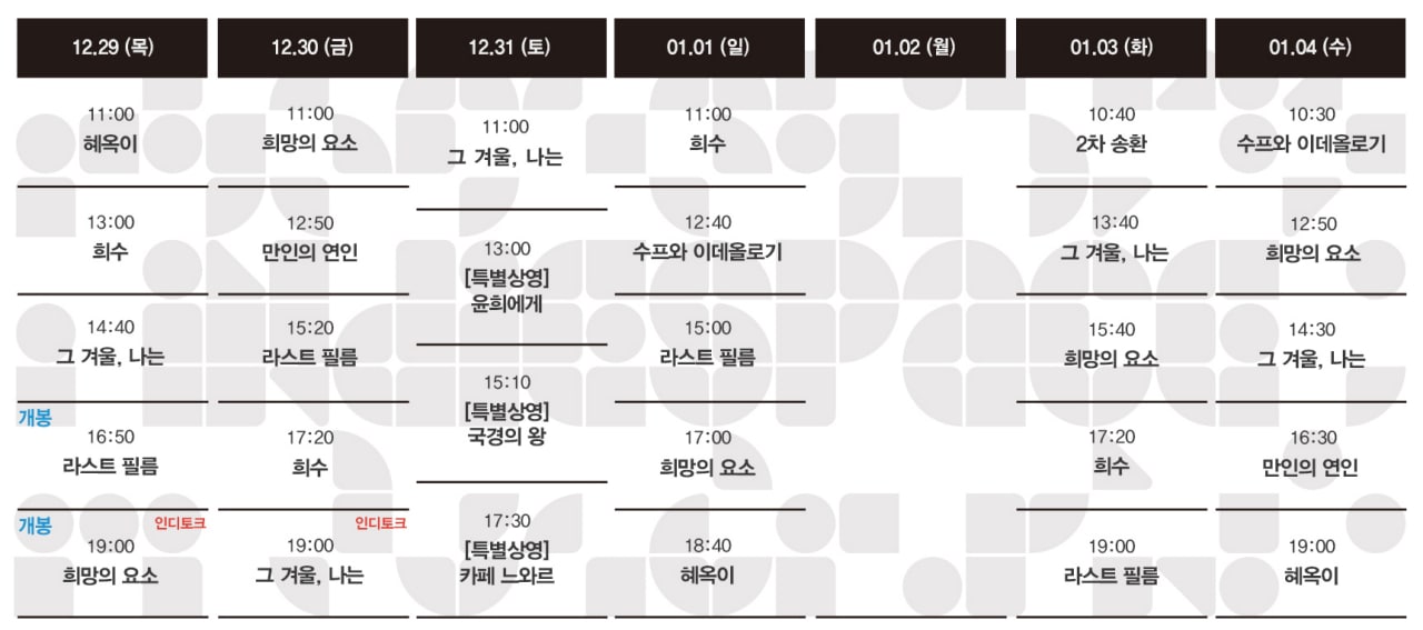Now Playing/상영시간표 [12.29-01.04 상영시간표] 희망의 요소 / 라스트 필름 / 희수 / 혜옥이 / 만인의 연인 / 그 겨울, 나는 / 수프와 이데올로기 / 2차 송환 by indiespace_은 2022. 12. 23. [클릭] 공유하기 게시글 관리 인디스페이스 indiespace 저작자표시 (새창열림) 'Now Playing > 상영시간표' 카테고리의 다른 글 [01.12-01.18 상영시간표] 나는 마을 방과후 교사입니다 / 시간을 꿈꾸는 소녀 / 희망의 요소 / 라스트 필름 / 희수 / 혜옥이 / 그 겨울, 나는 / 수프와 이데올로기 / 2차 송환 (0) 2023.01.06 [01.05-01.11 상영시간표] 시간을 꿈꾸는 소녀 / 희망의 요소 / 라스트 필름 / 희수 / 혜옥이 / 만인의 연인 / 그 겨울, 나는 / 수프와 이데올로기 / 2차 송환 (0) 2022.12.29 [12.22-12.28 상영시간표] 희수 / 혜옥이 / 만인의 연인 / 요정 / 그 겨울, 나는 / 우수 / 창밖은 겨울 / 수프와 이데올로기 / 2차 송환 (0) 2022.12.15 [12.15-12.21 상영시간표] 희수 / 혜옥이 / 만인의 연인 / 요정 / 그 겨울, 나는 / 우수 / 창밖은 겨울 / 수프와 이데올로기 / 2차 송환 (0) 2022.12.09 [12.08-12.14 상영시간표] 혜옥이 / 만인의 연인 / 요정 / 그 겨울, 나는 / 우수 / 창밖은 겨울 / 트랜스 / 같은 속옷을 입는 두 여자 / 수프와 이데올로기 (0) 2022.12.01 관련글 [01.12-01.18 상영시간표] 나는 마을 방과후 교사입니다 / 시간을 꿈꾸는 소녀 / 희망의 요소 / 라스트 필름 / 희수 / 혜옥이 / 그 겨울, 나는 / 수프와 이데올로기 / 2차 송환 [01.05-01.11 상영시간표] 시간을 꿈꾸는 소녀 / 희망의 요소 / 라스트 필름 / 희수 / 혜옥이 / 만인의 연인 / 그 겨울, 나는 / 수프와 이데올로기 / 2차 송환 [12.22-12.28 상영시간표] 희수 / 혜옥이 / 만인의 연인 / 요정 / 그 겨울, 나는 / 우수 / 창밖은 겨울 / 수프와 이데올로기 / 2차 송환 [12.15-12.21 상영시간표] 희수 / 혜옥이 / 만인의 연인 / 요정 / 그 겨울, 나는 / 우수 / 창밖은 겨울 / 수프와 이데올로기 / 2차 송환 댓글