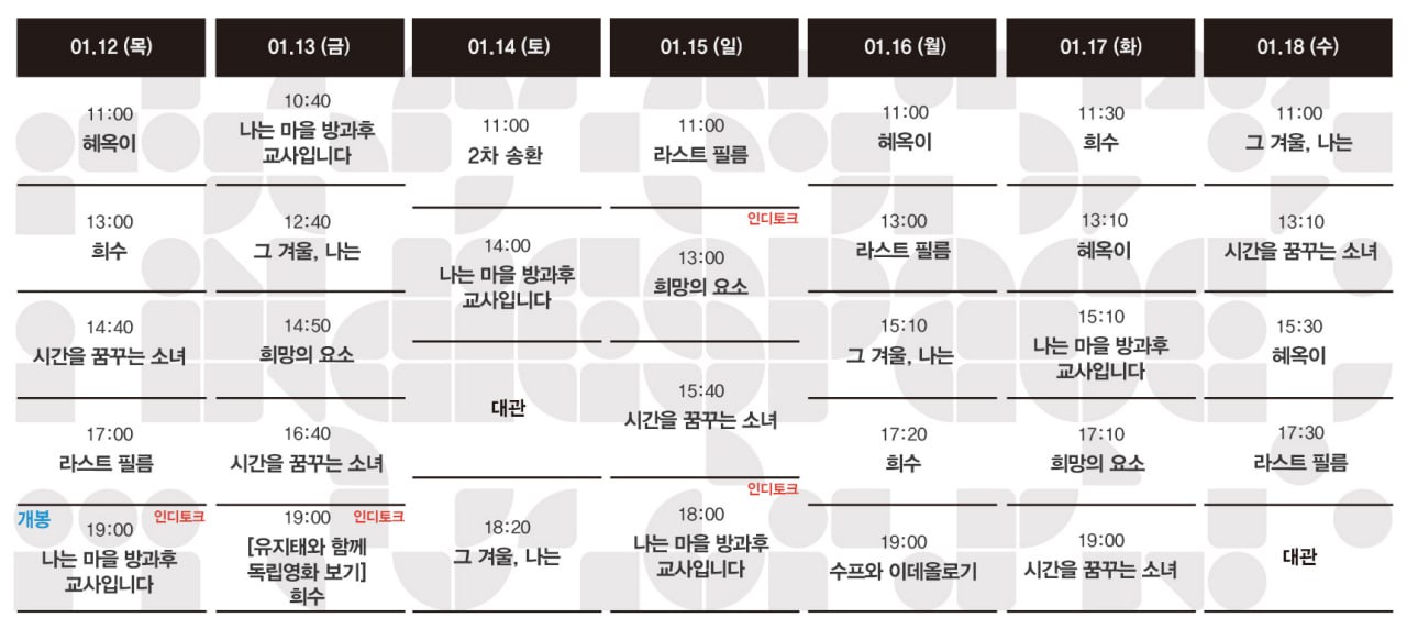 Now Playing/상영시간표 [01.12-01.18 상영시간표] 나는 마을 방과후 교사입니다 / 시간을 꿈꾸는 소녀 / 희망의 요소 / 라스트 필름 / 희수 / 혜옥이 / 그 겨울, 나는 / 수프와 이데올로기 / 2차 송환 by indiespace_은 2023. 1. 6. [클릭] 공유하기 게시글 관리 인디스페이스 indiespace 저작자표시 (새창열림) 'Now Playing > 상영시간표' 카테고리의 다른 글 [01.26-02.01 상영시간표] 열여덟, 어른이 되는 나이 / 엄마의 땅: 그리샤와 숲의 주인 / 나는 마을 방과후 교사입니다 / 시간을 꿈꾸는 소녀 / 희망의 요소 / 라스트 필름 / 희수 / 혜옥이 / 그 겨울, .. (0) 2023.01.19 [01.19-01.25 상영시간표] 나는 마을 방과후 교사입니다 / 시간을 꿈꾸는 소녀 / 희망의 요소 / 라스트 필름 / 희수 / 혜옥이 / 그 겨울, 나는 / 수프와 이데올로기 / 2차 송환 (0) 2023.01.12 [01.05-01.11 상영시간표] 시간을 꿈꾸는 소녀 / 희망의 요소 / 라스트 필름 / 희수 / 혜옥이 / 만인의 연인 / 그 겨울, 나는 / 수프와 이데올로기 / 2차 송환 (0) 2022.12.29 [12.29-01.04 상영시간표] 희망의 요소 / 라스트 필름 / 희수 / 혜옥이 / 만인의 연인 / 그 겨울, 나는 / 수프와 이데올로기 / 2차 송환 (0) 2022.12.23 [12.22-12.28 상영시간표] 희수 / 혜옥이 / 만인의 연인 / 요정 / 그 겨울, 나는 / 우수 / 창밖은 겨울 / 수프와 이데올로기 / 2차 송환 (0) 2022.12.15 관련글 [01.26-02.01 상영시간표] 열여덟, 어른이 되는 나이 / 엄마의 땅: 그리샤와 숲의 주인 / 나는 마을 방과후 교사입니다 / 시간을 꿈꾸는 소녀 / 희망의 요소 / 라스트 필름 / 희수 / 혜옥이 / 그 겨울, .. [01.19-01.25 상영시간표] 나는 마을 방과후 교사입니다 / 시간을 꿈꾸는 소녀 / 희망의 요소 / 라스트 필름 / 희수 / 혜옥이 / 그 겨울, 나는 / 수프와 이데올로기 / 2차 송환 [01.05-01.11 상영시간표] 시간을 꿈꾸는 소녀 / 희망의 요소 / 라스트 필름 / 희수 / 혜옥이 / 만인의 연인 / 그 겨울, 나는 / 수프와 이데올로기 / 2차 송환 [12.29-01.04 상영시간표] 희망의 요소 / 라스트 필름 / 희수 / 혜옥이 / 만인의 연인 / 그 겨울, 나는 / 수프와 이데올로기 / 2차 송환 댓글