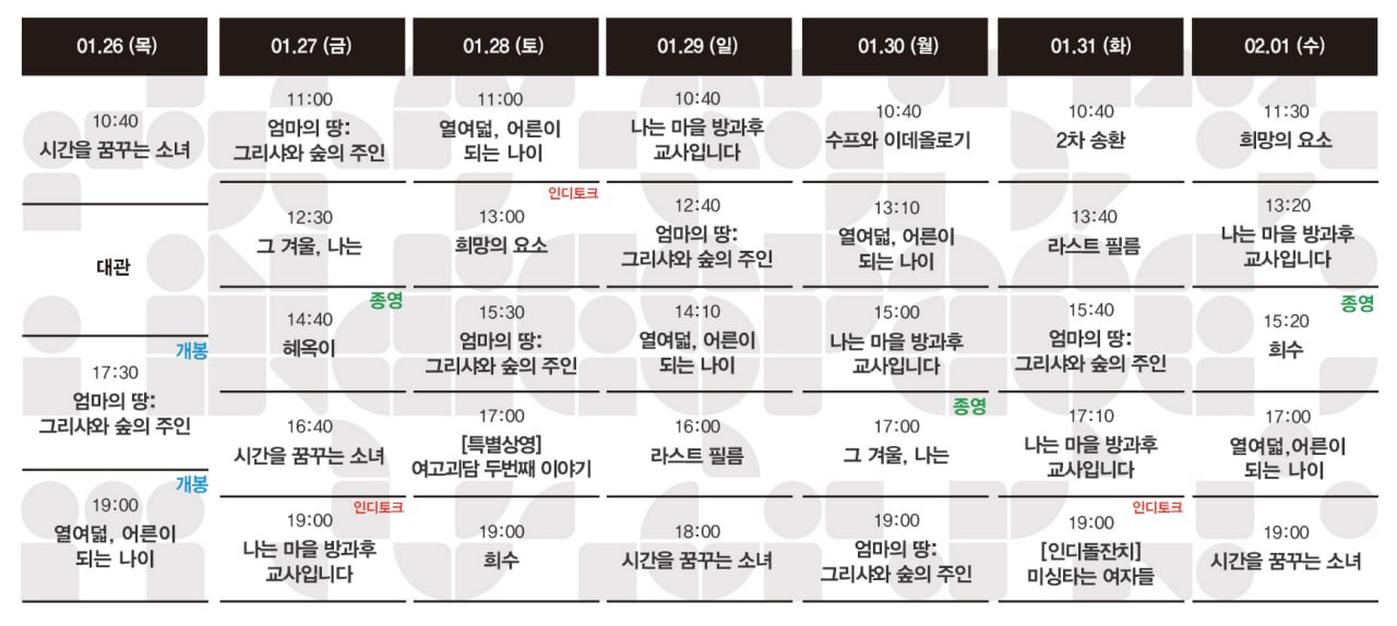 [01.26-02.01 상영시간표] 열여덟, 어른이 되는 나이 / 엄마의 땅: 그리샤와 숲의 주인 / 나는 마을 방과후 교사입니다 / 시간을 꿈꾸는 소녀 / 희망의 요소 / 라스트 필름 / 희수 / 혜옥이 / 그 겨울, ..