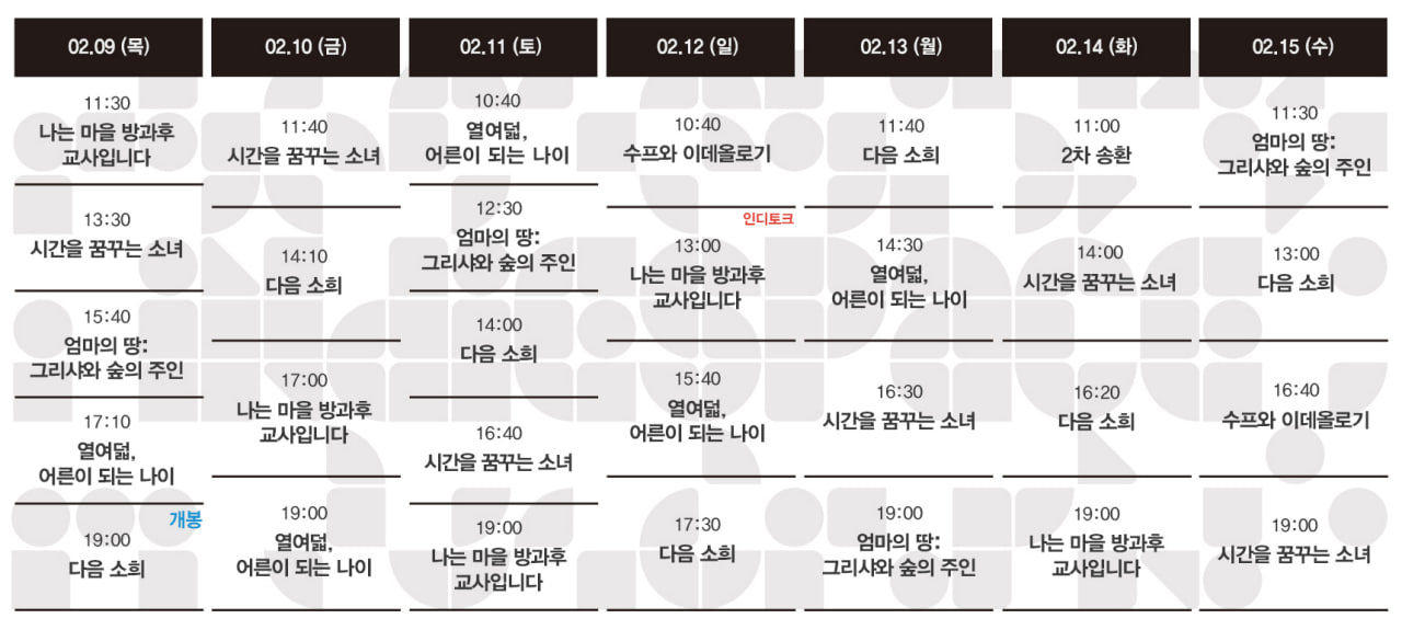 Now Playing/상영시간표 [02.09-02.15 상영시간표] 다음 소희 / 열여덟, 어른이 되는 나이 / 엄마의 땅: 그리샤와 숲의 주인 / 나는 마을 방과후 교사입니다 / 시간을 꿈꾸는 소녀 / 수프와 이데올로기 / 2차 송환 by indiespace_은 2023. 2. 3. [클릭] 공유하기 게시글 관리 인디스페이스 indiespace 저작자표시 (새창열림) 'Now Playing > 상영시간표' 카테고리의 다른 글 [02.23-03.01 상영시간표] 컨버세이션 / 어쩌면 우린 헤어졌는지 모른다 / 다음 소희 / 열여덟, 어른이 되는 나이 / 엄마의 땅: 그리샤와 숲의 주인 / 나는 마을 방과후 교사입니다 / 수프와 이데올.. (0) 2023.02.16 [02.16-02.22 상영시간표] 어쩌면 우린 헤어졌는지 모른다 / 다음 소희 / 열여덟, 어른이 되는 나이 / 엄마의 땅: 그리샤와 숲의 주인 / 나는 마을 방과후 교사입니다 / 시간을 꿈꾸는 소녀 / 수프와 .. (0) 2023.02.10 [02.02-02.08 상영시간표] 열여덟, 어른이 되는 나이 / 엄마의 땅: 그리샤와 숲의 주인 / 나는 마을 방과후 교사입니다 / 시간을 꿈꾸는 소녀 / 희망의 요소 / 라스트 필름 / 수프와 이데올로기 / 2차 .. (0) 2023.01.27 [01.26-02.01 상영시간표] 열여덟, 어른이 되는 나이 / 엄마의 땅: 그리샤와 숲의 주인 / 나는 마을 방과후 교사입니다 / 시간을 꿈꾸는 소녀 / 희망의 요소 / 라스트 필름 / 희수 / 혜옥이 / 그 겨울, .. (0) 2023.01.19 [01.19-01.25 상영시간표] 나는 마을 방과후 교사입니다 / 시간을 꿈꾸는 소녀 / 희망의 요소 / 라스트 필름 / 희수 / 혜옥이 / 그 겨울, 나는 / 수프와 이데올로기 / 2차 송환 (0) 2023.01.12 관련글 [02.23-03.01 상영시간표] 컨버세이션 / 어쩌면 우린 헤어졌는지 모른다 / 다음 소희 / 열여덟, 어른이 되는 나이 / 엄마의 땅: 그리샤와 숲의 주인 / 나는 마을 방과후 교사입니다 / 수프와 이데올.. [02.16-02.22 상영시간표] 어쩌면 우린 헤어졌는지 모른다 / 다음 소희 / 열여덟, 어른이 되는 나이 / 엄마의 땅: 그리샤와 숲의 주인 / 나는 마을 방과후 교사입니다 / 시간을 꿈꾸는 소녀 / 수프와 .. [02.02-02.08 상영시간표] 열여덟, 어른이 되는 나이 / 엄마의 땅: 그리샤와 숲의 주인 / 나는 마을 방과후 교사입니다 / 시간을 꿈꾸는 소녀 / 희망의 요소 / 라스트 필름 / 수프와 이데올로기 / 2차 .. [01.26-02.01 상영시간표] 열여덟, 어른이 되는 나이 / 엄마의 땅: 그리샤와 숲의 주인 / 나는 마을 방과후 교사입니다 / 시간을 꿈꾸는 소녀 / 희망의 요소 / 라스트 필름 / 희수 / 혜옥이 / 그 겨울, .. 댓글