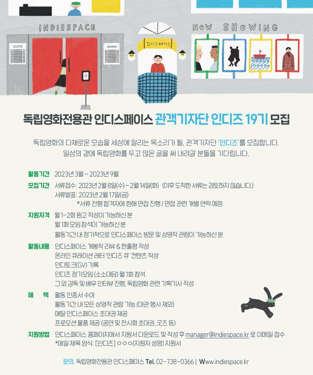 | [공지] 독립영화전용관 인디스페이스 관객기자단 인디즈 19기 서류 합격자 발표 연기 안내 (0) | 2023.02.17 |