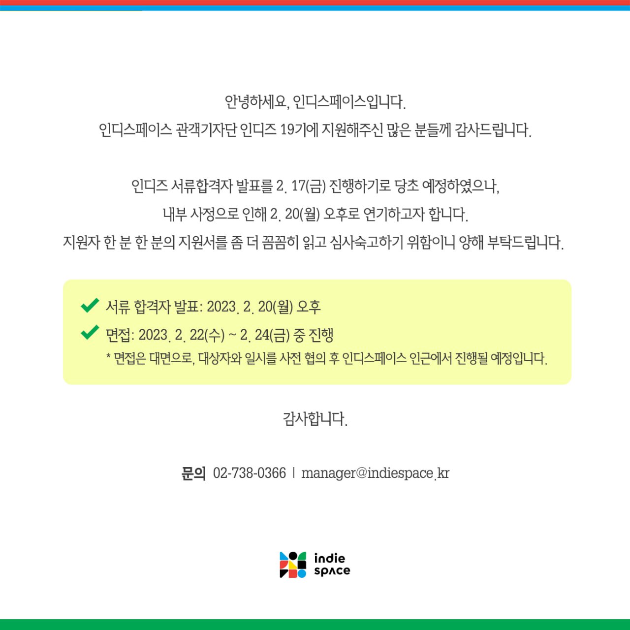 인디즈 서류합격자 발표를 2. 17(금) 진행하기로 당초 예정하였으나,