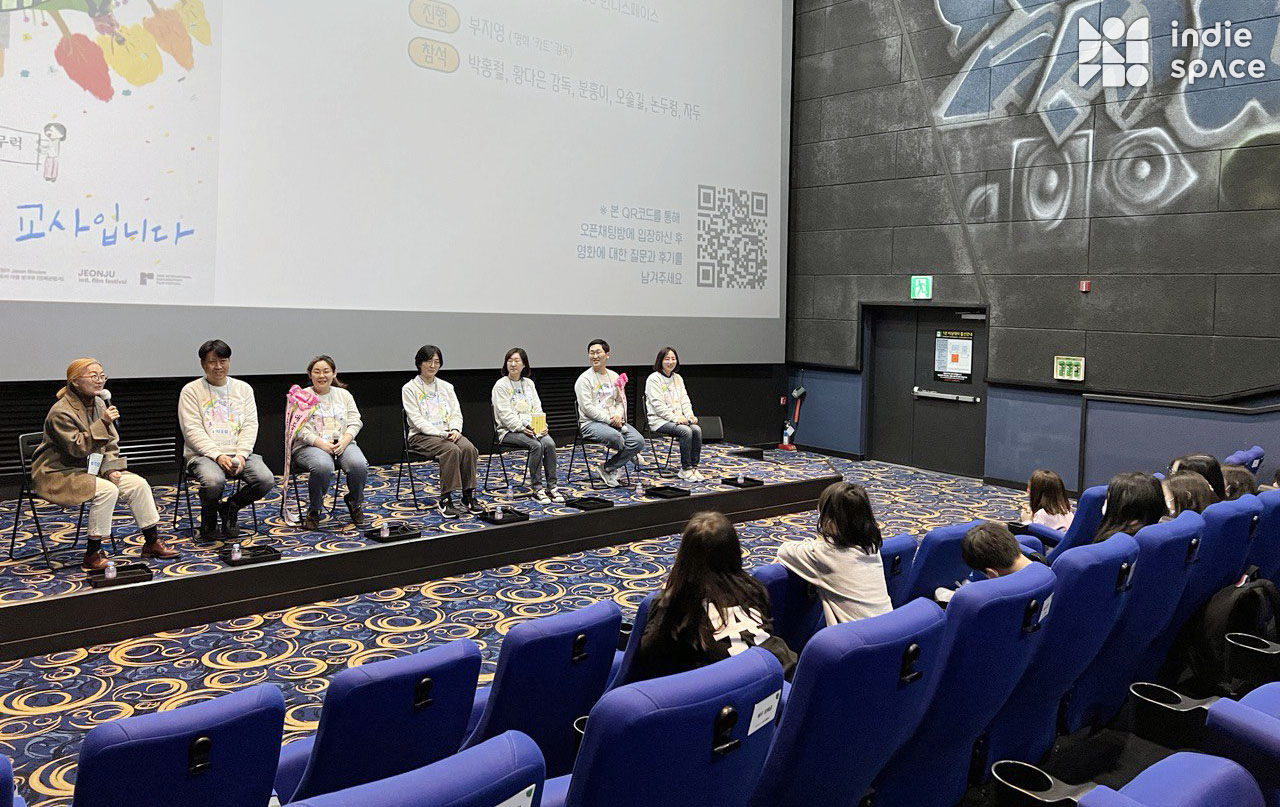 박홍열: 저희가 부산이랑 대구에서도 관객과의 대화를 진행했어요. 부산에는 '징검다리 놓는 아이들'이라는 방과후가 있어요. 그 동네에도 아주 예쁜 마을 극장이 있어서 그 곳에서 함께 관객과의 대화를 나눴는데 징검다리 놓는 아이들의 선생님이 저희 GV를 진행해주셨어요. 그때 선생님이 계속 똑같은 말을 많이 하셨어요. “우리 그렇게 우울하지 않고 잘 놀고 기운이 충만해요.” 저희 선생님들도 진짜 에너제틱하고 재밌고 신나는 분들이거든요. 영화는 좀 무겁지만, GV할 때는 관객들분께 웃음을 드리고 싶었어요. 그래서 선생님들의 에너지와 열정이 여러분들께 전달돼서 극장을 나가실 때 더 따뜻하고 충만한 마음을 갖고 나가셨으면 좋겠습니다. 감사합니다.