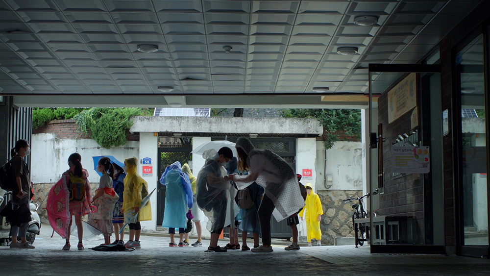 부지영: 또 질문 받을게요. 어린이 관객들도 질문하셔도 돼요. 감독님께 오픈채팅창으로 질문이 왔는데요. 선생님들이 문을 열고 출근하는 아침 장면들이 반복하여 나왔습니다. 나중에는 핸드헬드로 찍으신 장면들을 영화의 첫 부분에는 고정된 카메라와 클로즈업으로 보여주셨는데 의도가 있으셨을까요?