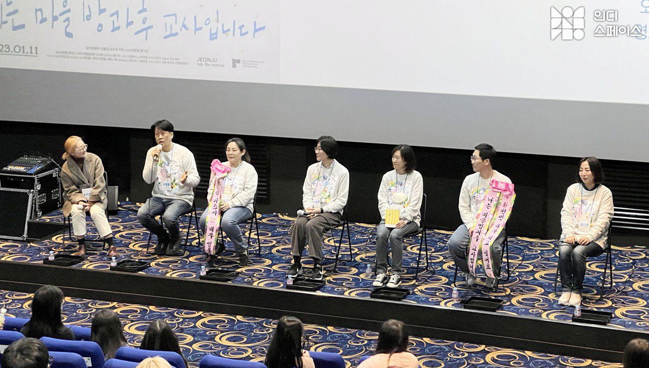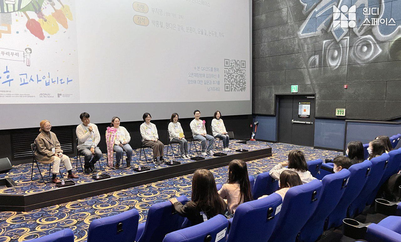 박홍열: 저희가 부산이랑 대구에서도 관객과의 대화를 진행했어요. 부산에는 '징검다리 놓는 아이들'이라는 방과후가 있어요. 그 동네에도 아주 예쁜 마을 극장이 있어서 그 곳에서 함께 관객과의 대화를 나눴는데 징검다리 놓는 아이들의 선생님이 저희 GV를 진행해주셨어요. 그때 선생님이 계속 똑같은 말을 많이 하셨어요. “우리 그렇게 우울하지 않고 잘 놀고 기운이 충만해요.” 저희 선생님들도 진짜 에너제틱하고 재밌고 신나는 분들이거든요. 영화는 좀 무겁지만, GV할 때는 관객들분께 웃음을 드리고 싶었어요. 그래서 선생님들의 에너지와 열정이 여러분들께 전달돼서 극장을 나가실 때 더 따뜻하고 충만한 마음을 갖고 나가셨으면 좋겠습니다. 감사합니다.