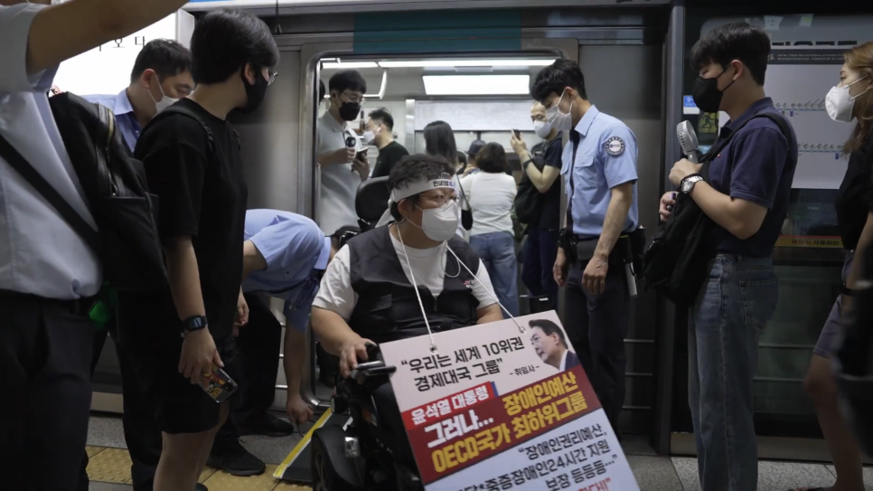 오늘도 어김없이 장애인차별철폐연대는 4호선 삼각지역에서 삭발식을 진행했다. 삭발투쟁을 시작한지 84일이 지났다. 아침 출근길, 지하철 문이 열리면 사람들에게서 어떤 시선들이 느껴진다. 그럼에도 불구하고 장애인들은 지하철을 탄다.