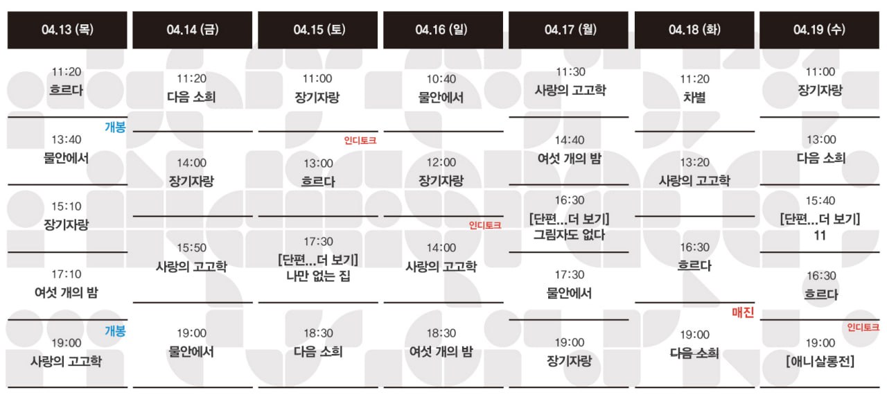 Now Playing/상영시간표 [04.13-04.19 상영시간표] 사랑의 고고학 / 물안에서 / 장기자랑 / 흐르다 / 여섯 개의 밤 / 차별 / 다음 소희 by indiespace_은 2023. 4. 6. 공유하기 게시글 관리 인디스페이스 indiespace 저작자표시 (새창열림) 'Now Playing > 상영시간표' 카테고리의 다른 글 [04.27-05.03 상영시간표] 라이스보이 슬립스 / 사랑의 고고학 / 물안에서 / 장기자랑 / 흐르다 / 여섯 개의 밤 / 차별 / 다음 소희 (0) 2023.04.20 [04.20-04.26 상영시간표] 라이스보이 슬립스 / 사랑의 고고학 / 물안에서 / 장기자랑 / 흐르다 / 여섯 개의 밤 / 차별 / 다음 소희 (0) 2023.04.13 [04.06-04.12 상영시간표] 장기자랑 / 흐르다 / 여섯 개의 밤 / 차별 / 다음 소희 (0) 2023.03.31 [03.30-04.05 상영시간표] 장기자랑 / 흐르다 / 여섯 개의 밤 / 차별 / 컨버세이션 / 다음 소희 (0) 2023.03.24 [03.23-03.29 상영시간표] 흐르다 / 여섯 개의 밤 / 차별 / 컨버세이션 / 어쩌면 우린 헤어졌는지 모른다 / 병구 / 다음 소희 / 11 / 엄마의 땅: 그리샤와 숲의 주인 (0) 2023.03.17 관련글 [04.27-05.03 상영시간표] 라이스보이 슬립스 / 사랑의 고고학 / 물안에서 / 장기자랑 / 흐르다 / 여섯 개의 밤 / 차별 / 다음 소희 [04.20-04.26 상영시간표] 라이스보이 슬립스 / 사랑의 고고학 / 물안에서 / 장기자랑 / 흐르다 / 여섯 개의 밤 / 차별 / 다음 소희 [04.06-04.12 상영시간표] 장기자랑 / 흐르다 / 여섯 개의 밤 / 차별 / 다음 소희 [03.30-04.05 상영시간표] 장기자랑 / 흐르다 / 여섯 개의 밤 / 차별 / 컨버세이션 / 다음 소희 댓글