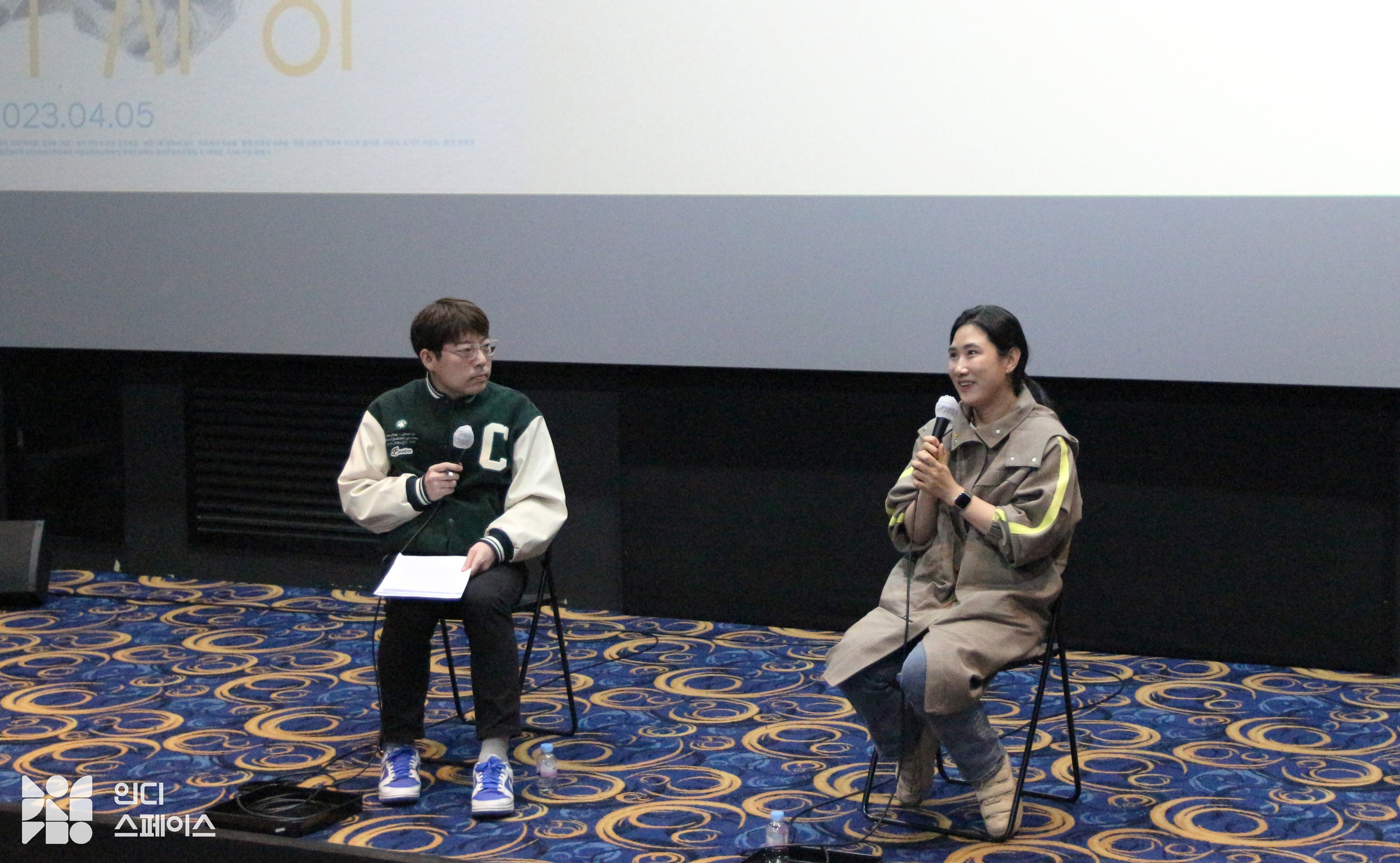 곽명동: 박수 한번 부탁드립니다. 굉장히 힘을 들여서 만들었다. 제가 영화사 보도 자료를 보다가 깜짝 놀랐는데 약력을 보니까 감독님께서 직접 쓰신 것 같은데 정수기 판매원, 광고 프로듀서, NGO 활동가, 동시 녹음 기사, 여기서 사운드 전공이 나오는 거죠. 팔레스타인에 갔다가 다큐멘터리 시작 이게 끝이에요. 그래서 여러분들 너무 궁금하지 않으세요, 감독님의 삶이? 영화에 어머님들도 어쩌다 연극 배우가 되셨는지에 대한 과정이 담겨 있는데 감독님도 어쩌다 다큐멘터리 감독이 되셨는가. 이것만 보기에는 어떻게 된 건지 잘 모르겠어서 그 부분에 대해서 설명을 듣고 싶습니다.
