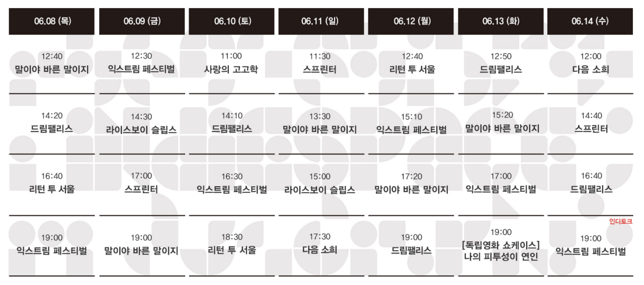 Now Playing/상영시간표 [06.08-06.14 상영시간표] 익스트림 페스티벌 / 드림팰리스 / 스프린터 / 말이야 바른 말이지 / 리턴 투 서울 / 라이스보이 슬립스 / 사랑의 고고학 / 다음 소희 by indiespace_은 2023. 6. 2. 공유하기 게시글 관리 인디스페이스 indiespace 저작자표시 (새창열림) 'Now Playing > 상영시간표' 카테고리의 다른 글 [06.22-06.28 상영시간표] 수라 / 206: 사라지지 않는 / 익스트림 페스티벌 / 드림팰리스 / 스프린터 / 말이야 바른 말이지 / 다음 소희 (0) 2023.06.16 [06.15-06.21 상영시간표] 206: 사라지지 않는 / 익스트림 페스티벌 / 드림팰리스 / 스프린터 / 말이야 바른 말이지 / 리턴 투 서울 / 라이스보이 슬립스 / 사랑의 고고학 / 다음 소희 (0) 2023.06.08 [06.01-06.07 상영시간표] 익스트림 페스티벌 / 드림팰리스 / 스프린터 / 말이야 바른 말이지 / 리턴 투 서울 / 라이스보이 슬립스 / 사랑의 고고학 / 다음 소희 (0) 2023.05.26 [05.25-05.31 상영시간표] 드림팰리스 / 스프린터 / 말이야 바른 말이지 / 리턴 투 서울 / 라이스보이 슬립스 / 사랑의 고고학 / 다음 소희 (0) 2023.05.18 [05.18-05.24 상영시간표] 스프린터 / 말이야 바른 말이지 / 리턴 투 서울 / 라이스보이 슬립스 / 사랑의 고고학 / 장기자랑 / 다음 소희 (0) 2023.05.11 관련글 [06.22-06.28 상영시간표] 수라 / 206: 사라지지 않는 / 익스트림 페스티벌 / 드림팰리스 / 스프린터 / 말이야 바른 말이지 / 다음 소희 [06.15-06.21 상영시간표] 206: 사라지지 않는 / 익스트림 페스티벌 / 드림팰리스 / 스프린터 / 말이야 바른 말이지 / 리턴 투 서울 / 라이스보이 슬립스 / 사랑의 고고학 / 다음 소희 [06.01-06.07 상영시간표] 익스트림 페스티벌 / 드림팰리스 / 스프린터 / 말이야 바른 말이지 / 리턴 투 서울 / 라이스보이 슬립스 / 사랑의 고고학 / 다음 소희 [05.25-05.31 상영시간표] 드림팰리스 / 스프린터 / 말이야 바른 말이지 / 리턴 투 서울 / 라이스보이 슬립스 / 사랑의 고고학 / 다음 소희 댓글