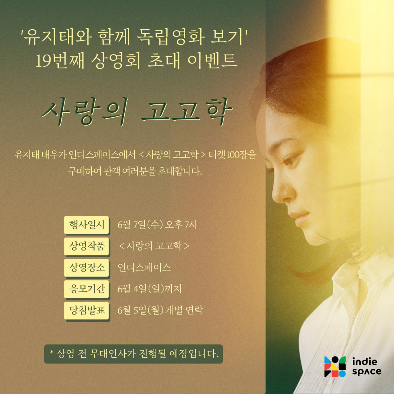 유지태 배우가 인디스페이스에서 <사랑의 고고학> 티켓 100장을 구매하여 관객 여러분을 초대합니다.