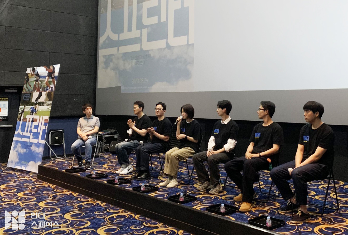 최승연 감독(이하 최승연): 네, 안녕하세요. 〈스프린터〉연출한 최승연입니다. 오늘 이렇게 와 주셔서 감사드리고요, 다른 GV나 개봉 준비하면서 기획전이나 서울독립영화제나 이런 걸 통해서 많은 분들한테 보여드렸는데, 오늘 또 어떤 질문이 나올지 궁금하기도 합니다. 질문 받고, 평론가님이랑 이야기하면서 제가 설명드릴 수 있는 부분에 대해서 자세하게 말씀드리도록 하겠습니다. 와 주셔서 감사합니다.