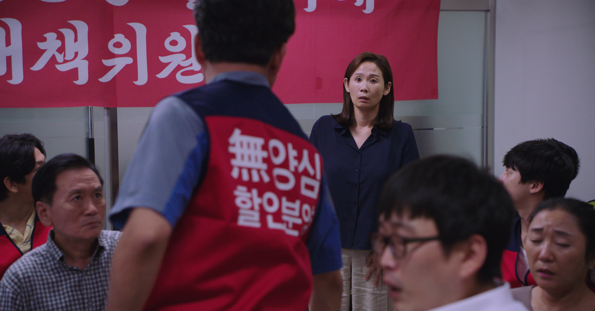 드림팰리스 입주민들에게 ‘우리’는 할인 분양 받지 않고 제값을 지불하고 들어온 입주민만을 의미하고, 함께 가족의 일원을 잃은 유가족 모임에서도 하청업체 노동자와 기업 관리자의 유가족은 나뉜다. 동일한 상황에 놓여, 동일한 목적에 동의 할 수 있는 사람만이 ‘우리’가 된다. 함께 싸우기 위해 힘을 합쳐야 할 ‘우리’는 당장의 쓸모에 따라 배타적으로만 쓰인다. 입주민 대표 인호는 분양 홍보 전단을 붙이는 혜정에게 ‘어느 편’이냐 물으며 자동차의 앞을 막아버리고, 유가족 대표 호섭은 ‘우리’안에서의 외로움을 고백하는 혜정의 말에 어떤 반응도 내보이지 못한다. 혜정도 다른 사람들과 다르지 않다. 길성하이텍 건물 화장실에 질러진 불에 대해 동욱에게 질문을 던지는 이들을 향해 혜정은 “지금 우리 애를 의심하는 것이냐”며 질색한다. ‘우리’의 조건과 함께 찾아가야 할 책임자에 대해 따져 묻는 일은 모두에게 뒷전이다.
