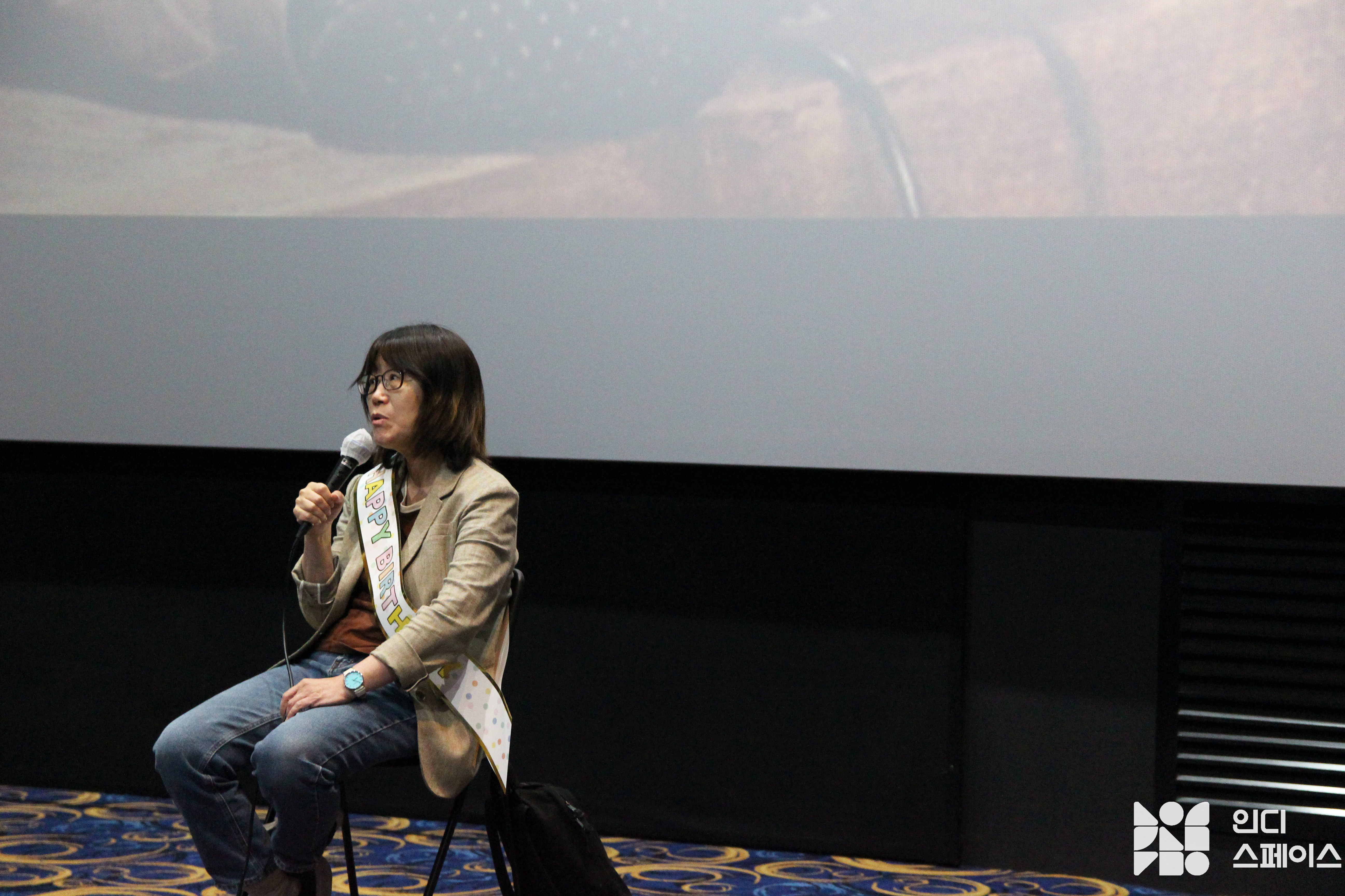 신수원 감독(이하 신수원): 미스코리아 된 기분입니다. (웃음) 작년 5월 31일인가에 개봉을 했거든요. 오늘이 딱 개봉 1주년이더라고요. 그런데 인디돌잔치가 인디스페이스의 돌잔치에 당선이 되어서 너무 기쁘고요(웃음). 제가 원래는 몇 달 전에 영상자료원에서 GV를 하면서 마지막 GV가 될 것 같다고 말씀드렸거든요. 그런데 오늘 돌잔치인데 안 올 수는 없잖아요. 아무쪼록 늦은 시간인데도 와 주셔서 감사합니다.