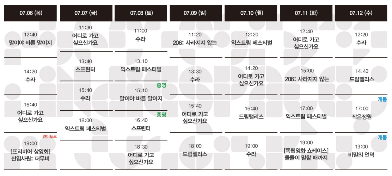 Now Playing/상영시간표 [07.06-07.12 상영시간표] 작은정원 / 비밀의 언덕 / 어디로 가고 싶으신가요 / 수라 / 206: 사라지지 않는 / 익스트림 페스티벌 / 드림팰리스 / 스프린터 / 말이야 바른 말이지 by indiespace_은 2023. 6. 29. 공유하기 게시글 관리 인디스페이스 indiespace 저작자표시 (새창열림) 'Now Playing > 상영시간표' 카테고리의 다른 글 [07.20-07.26 상영시간표] 비닐하우스 / 작은정원 / 비밀의 언덕 / 어디로 가고 싶으신가요 / 수라 / 206: 사라지지 않는 / 익스트림 페스티벌 (0) 2023.07.14 [07.13-07.19 상영시간표] 작은정원 / 비밀의 언덕 / 어디로 가고 싶으신가요 / 수라 / 206: 사라지지 않는 / 익스트림 페스티벌 / 드림팰리스 (0) 2023.07.07 [06.29-07.05 상영시간표] 어디로 가고 싶으신가요 / 수라 / 206: 사라지지 않는 / 익스트림 페스티벌 / 드림팰리스 / 스프린터 / 말이야 바른 말이지 / 다음 소희 (0) 2023.06.22 [06.22-06.28 상영시간표] 수라 / 206: 사라지지 않는 / 익스트림 페스티벌 / 드림팰리스 / 스프린터 / 말이야 바른 말이지 / 다음 소희 (0) 2023.06.16 [06.15-06.21 상영시간표] 206: 사라지지 않는 / 익스트림 페스티벌 / 드림팰리스 / 스프린터 / 말이야 바른 말이지 / 리턴 투 서울 / 라이스보이 슬립스 / 사랑의 고고학 / 다음 소희 (0) 2023.06.08 관련글 [07.20-07.26 상영시간표] 비닐하우스 / 작은정원 / 비밀의 언덕 / 어디로 가고 싶으신가요 / 수라 / 206: 사라지지 않는 / 익스트림 페스티벌 [07.13-07.19 상영시간표] 작은정원 / 비밀의 언덕 / 어디로 가고 싶으신가요 / 수라 / 206: 사라지지 않는 / 익스트림 페스티벌 / 드림팰리스 [06.29-07.05 상영시간표] 어디로 가고 싶으신가요 / 수라 / 206: 사라지지 않는 / 익스트림 페스티벌 / 드림팰리스 / 스프린터 / 말이야 바른 말이지 / 다음 소희 [06.22-06.28 상영시간표] 수라 / 206: 사라지지 않는 / 익스트림 페스티벌 / 드림팰리스 / 스프린터 / 말이야 바른 말이지 / 다음 소희 댓글