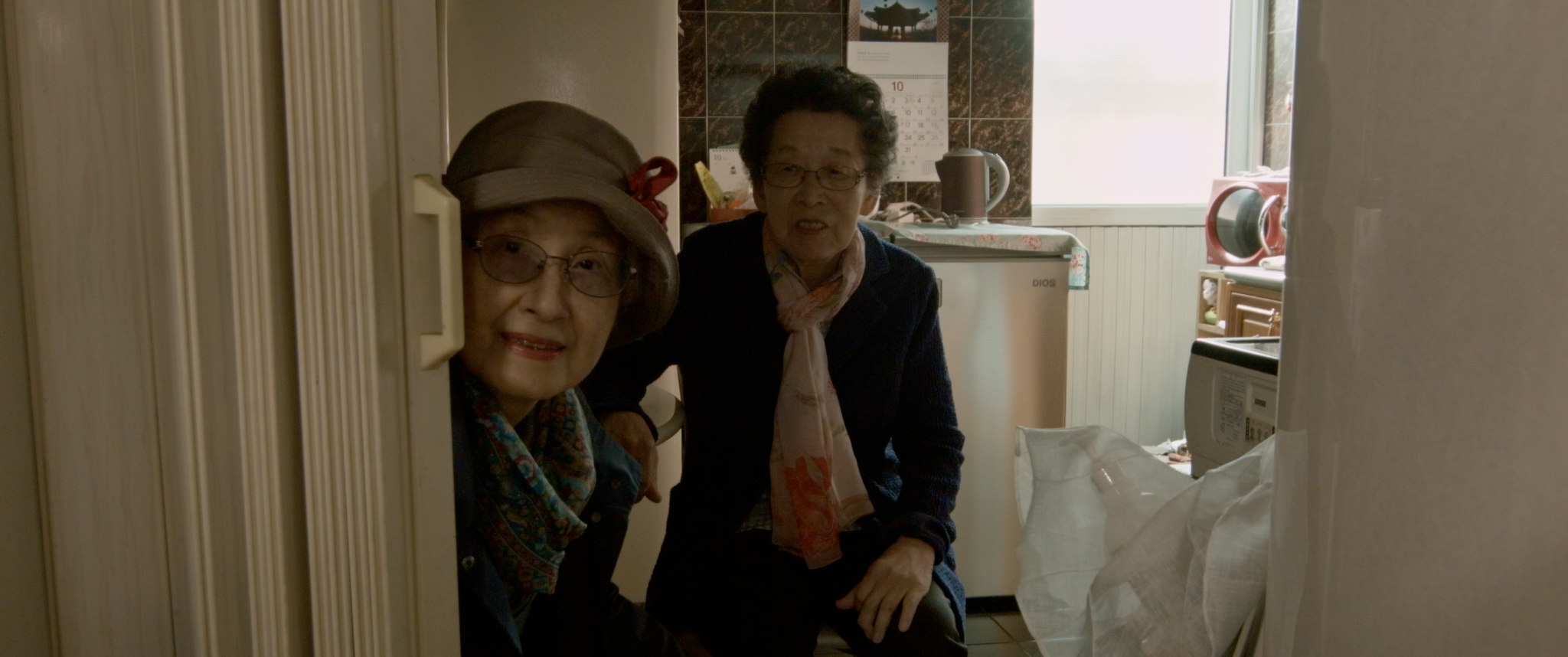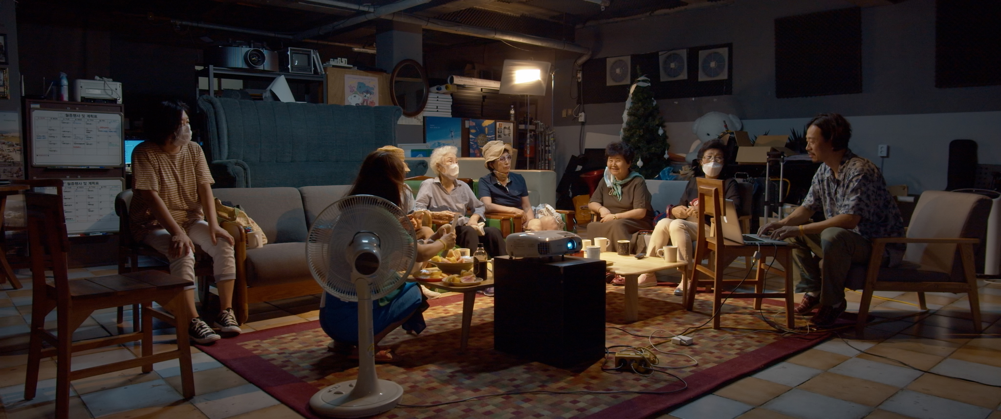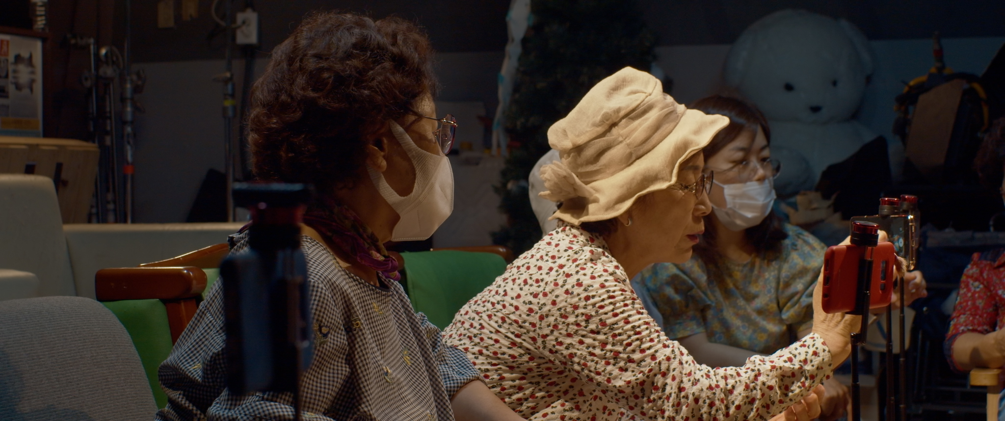 이마리오: 처음에 기획 단계에서 한 2년 찍으면 충분하겠다는 생각을 했어요. 그런데 이제 1년 지나고 2020년이 돼서 이제 본격적으로 언니들의 내밀한 개인들의 공간으로 들어가겠다는 계획을 하고 있었는데 코로나가 터진 거죠. 그러면서 거의 6개월 이상 사실 촬영을 못했어요. 아예 언니들이 집 밖을 나오지도 않으셨어요. 본인이 이제 나이 드신 분도 있었고 또 한편으로는 자식들한테도 민폐가 될까 봐 아예 집 밖으로 나오지 않으셔서 그때 촬영이 연기되면서 1년을 더 찍게 됐어요. 편집이 굉장히 여러 가지 버전이 있는데 초반 편집본은 언니들이 찍은 스마트폰 영상이 없는 다른 흐름의 이야기들로 됐는데 그걸 보면 조금 더 예술적일 수도 있고 더 작가적인 느낌이 나오는 영상일 수도 있는데 제가 봐도 재미가 없더라고요. 그래서 이건 아니다 싶었어요. 그리고 그전까지 사실 언니들이 찍은 영상은 제대로 본 적이 없었는데 그때 처음부터 모든 영상을 다시 쭉 훑어보게 되면서 느낀 것이 있었죠. 처음 영상을 배우고 만들 때에 들었던 생각들이 그 영상에 굉장히 잘 담겨 있었어요. 그런 에너지가 좋아서 언니들 영상을 조금 쓰는 게 아니라 대놓고 쓴다, 그렇게 전략을 딱 바꿨어요. 실제로 영화를 보면 언니들이 촬영한 영상이 50% 이상이에요. 제가 숟가락을 얹었다는 이유가 그런 지점인 거고요.