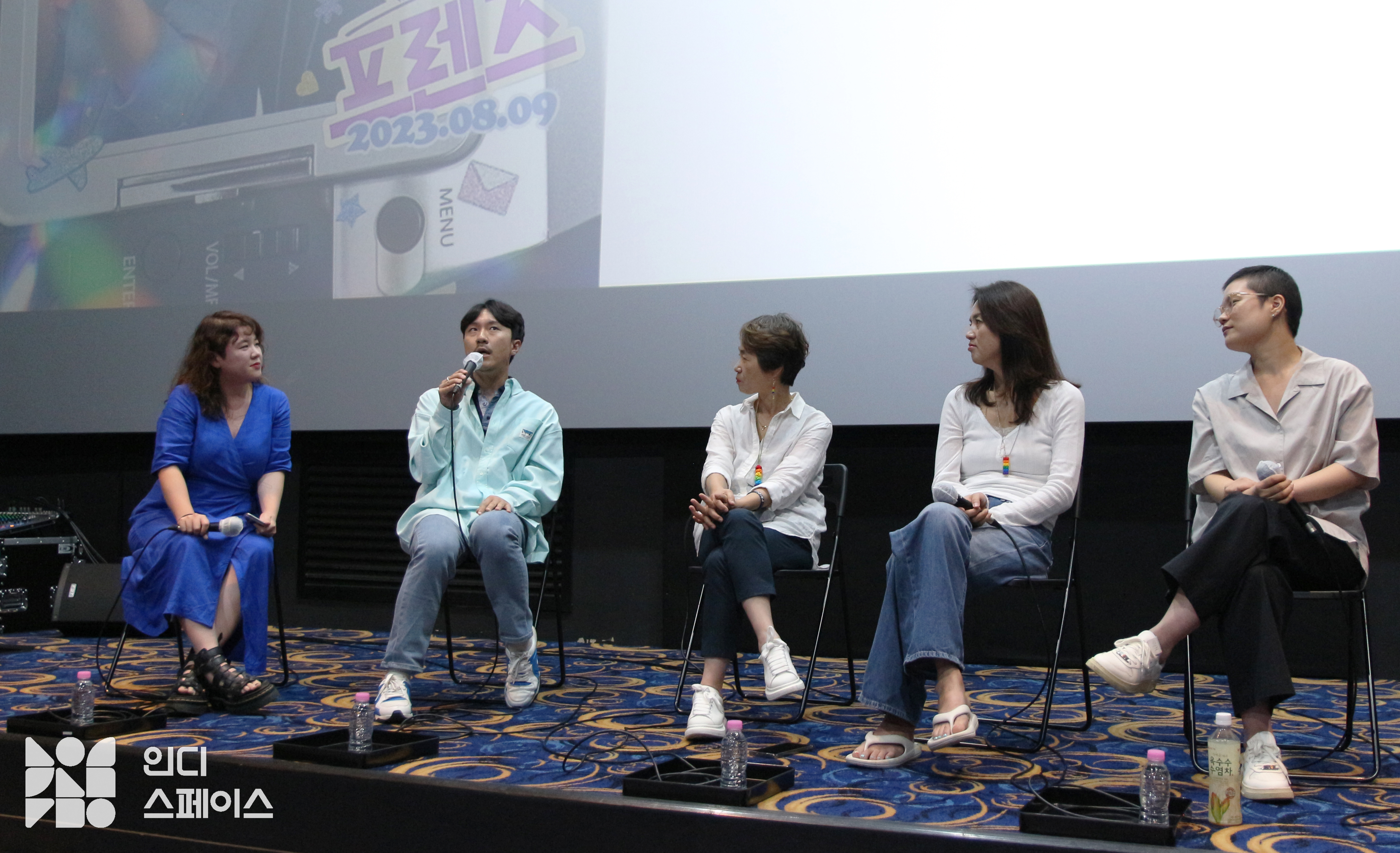 강사라 프로듀서(이하 강사라): 〈퀴어 마이 프렌즈〉 프로듀서 강사라라고 합니다. 오늘 극장을 찾아주신 여러분 너무 감사드립니다. 먼저 영화의 주인공과 감독님이신 송강원 님과 서아현 감독님, 더불어 오늘 자리를 빛내주신 나비 님, 비비안 님 자리로 모셔보겠습니다.