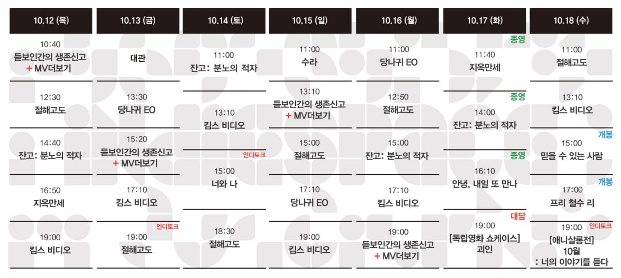 Now Playing/상영시간표 [10.12-10.18 상영시간표] 너와 나 / 믿을 수 있는 사람 / 프리 철수 리 / 당나귀 EO / 절해고도 / 킴스 비디오 / 잔고: 분노의 적자 / 안녕, 내일 또 만나 / 듣보인간의 생존신고 / 지옥만세 / 수라 by indiespace_은 2023. 10. 6. 공유하기 게시글 관리 인디스페이스 indiespace 저작자표시 (새창열림) 'Now Playing > 상영시간표' 카테고리의 다른 글 [10.26-11.01 상영시간표] 두 사람을 위한 식탁 / 너와 나 / 우리의 하루 / 믿을 수 있는 사람 / 프리 철수 리 / 절해고도 / 킴스 비디오 (0) 2023.10.19 [10.19-10.25 상영시간표] 두 사람을 위한 식탁 / 너와 나 / 우리의 하루 / 믿을 수 있는 사람 / 프리 철수 리 / 당나귀 EO / 절해고도 / 킴스 비디오 / 듣보인간의 생존신고 / 수라 (0) 2023.10.12 [10.05-10.11 상영시간표] 당나귀 EO / 절해고도 / 킴스 비디오 / 잔고: 분노의 적자 / 안녕, 내일 또 만나 / 듣보인간의 생존신고 / 그녀의 취미생활 / 지옥만세 / 수라 (0) 2023.09.27 [09.28-10.04 상영시간표] 당나귀 EO / 절해고도 / 킴스 비디오 / 잔고: 분노의 적자 / 안녕, 내일 또 만나 / 듣보인간의 생존신고 / 피아노 프리즘 / 물꽃의 전설 / 그녀의 취미생활 / 지옥만세 / 수라 (0) 2023.09.22 [09.21-09.27 상영시간표] 절해고도 / 킴스 비디오 / 잔고: 분노의 적자 / 안녕, 내일 또 만나 / 듣보인간의 생존신고 / 피아노 프리즘 / 물꽃의 전설 / 그녀의 취미생활 / 지옥만세 / 퀴어 마이 프렌즈 (0) 2023.09.15 관련글 [10.26-11.01 상영시간표] 두 사람을 위한 식탁 / 너와 나 / 우리의 하루 / 믿을 수 있는 사람 / 프리 철수 리 / 절해고도 / 킴스 비디오 [10.19-10.25 상영시간표] 두 사람을 위한 식탁 / 너와 나 / 우리의 하루 / 믿을 수 있는 사람 / 프리 철수 리 / 당나귀 EO / 절해고도 / 킴스 비디오 / 듣보인간의 생존신고 / 수라 [10.05-10.11 상영시간표] 당나귀 EO / 절해고도 / 킴스 비디오 / 잔고: 분노의 적자 / 안녕, 내일 또 만나 / 듣보인간의 생존신고 / 그녀의 취미생활 / 지옥만세 / 수라 [09.28-10.04 상영시간표] 당나귀 EO / 절해고도 / 킴스 비디오 / 잔고: 분노의 적자 / 안녕, 내일 또 만나 / 듣보인간의 생존신고 / 피아노 프리즘 / 물꽃의 전설 / 그녀의 취미생활 / 지옥만세 / 수라 댓글