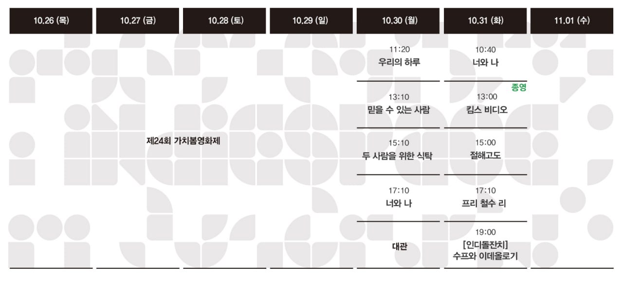 Now Playing/상영시간표 [10.26-11.01 상영시간표] 두 사람을 위한 식탁 / 너와 나 / 우리의 하루 / 믿을 수 있는 사람 / 프리 철수 리 / 절해고도 / 킴스 비디오 by indiespace_은 2023. 10. 19. 공유하기 게시글 관리 인디스페이스 indiespace 저작자표시 (새창열림) 'Now Playing > 상영시간표' 카테고리의 다른 글 11.09-11.15 상영시간표 (0) 2023.11.02 11.02-11.08 상영시간표 (0) 2023.10.27 [10.19-10.25 상영시간표] 두 사람을 위한 식탁 / 너와 나 / 우리의 하루 / 믿을 수 있는 사람 / 프리 철수 리 / 당나귀 EO / 절해고도 / 킴스 비디오 / 듣보인간의 생존신고 / 수라 (0) 2023.10.12 [10.12-10.18 상영시간표] 너와 나 / 믿을 수 있는 사람 / 프리 철수 리 / 당나귀 EO / 절해고도 / 킴스 비디오 / 잔고: 분노의 적자 / 안녕, 내일 또 만나 / 듣보인간의 생존신고 / 지옥만세 / 수라 (0) 2023.10.06 [10.05-10.11 상영시간표] 당나귀 EO / 절해고도 / 킴스 비디오 / 잔고: 분노의 적자 / 안녕, 내일 또 만나 / 듣보인간의 생존신고 / 그녀의 취미생활 / 지옥만세 / 수라 (0) 2023.09.27 관련글 11.09-11.15 상영시간표 11.02-11.08 상영시간표 [10.19-10.25 상영시간표] 두 사람을 위한 식탁 / 너와 나 / 우리의 하루 / 믿을 수 있는 사람 / 프리 철수 리 / 당나귀 EO / 절해고도 / 킴스 비디오 / 듣보인간의 생존신고 / 수라 [10.12-10.18 상영시간표] 너와 나 / 믿을 수 있는 사람 / 프리 철수 리 / 당나귀 EO / 절해고도 / 킴스 비디오 / 잔고: 분노의 적자 / 안녕, 내일 또 만나 / 듣보인간의 생존신고 / 지옥만세 / 수라 댓글