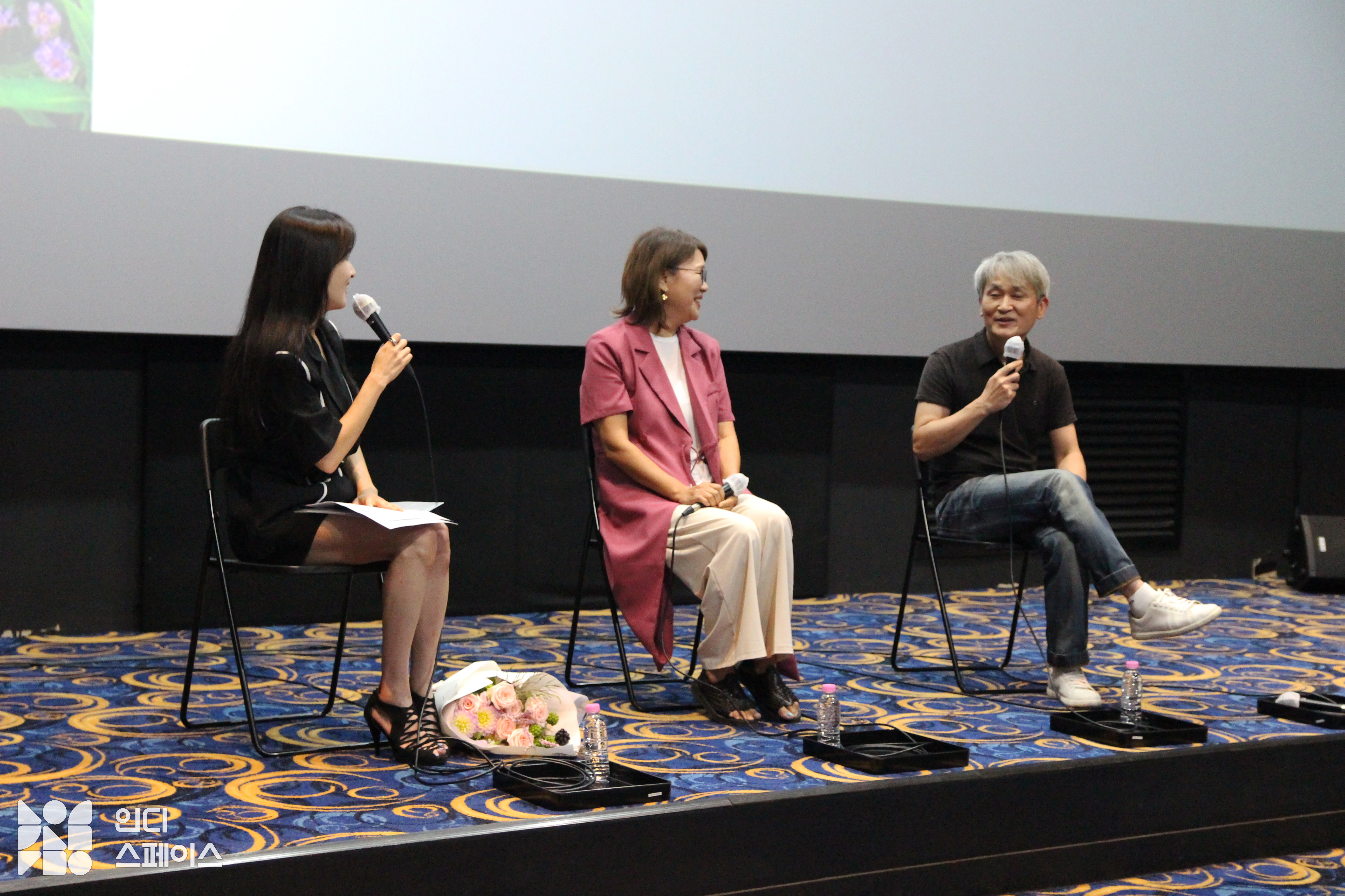 김경란 아나운서 (이하 김경란): 팬으로서 이 자리에 오늘 함께하게 됐습니다. 여러분 반갑습니다. 오늘 〈물꽃의 전설〉 어떻게 보셨을 지 참 궁금합니다. 아마 여러분도 지금 가슴 속에 많은 감동과 하고 싶은 이야기를 간직하고 이 자리에 앉아 계시리라고 생각을 합니다. 저 또한 〈물꽃의 전설〉을 보고 영화가 어떻게 이렇게 잔잔하면서도 먹먹할 수 있을까 생각했어요. 그 때 제가 느낀 감정은 아마 자연이 주는 감동에서 온 것이겠죠. 인간이 만들어 놓은 어떤 현란하고 화려하고 것보다 자연이 주는 감동이 이렇게 여운이 깊고 가슴이 먹먹하게 만든다는 것을 배웁니다. 또 그 자연에게서 삶을 배운 한 인간의 발자취를 따라간다는 것, 그 삶을 본다는 것은 바로 이런 느낌이구나, 라는 생각을 하면서 이 영화 봤던 기억이 나는데요. 두 분께 각각 개봉 소감을 들어볼게요.