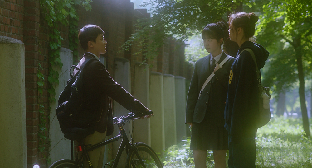 이동진: 굉장히 사소한데 영화를 보면서 무척 궁금했던 점이 있습니다. 배우들이 프레임에 들어오고 나가는 방식에 대해 여쭤보고 싶은데요, 흥미로운 동선이 상당히 많았던 것 같아요. 영화에서 하은을 자전거로 친 잘생겼다는 오빠와 하은이 대화를 하고 있는데 그 오빠의 친구들이 카메라 바로 앞 높은 곳에서 뛰어내리는 방식으로 프레임에 들어와요. 어떻게 생각하면 굉장히 난폭한 방식처럼 느껴지기도 하는데요. 그래서 저는 흔한 설정처럼 두 사람이 세미와 하은을 괴롭히나, 싶었는데 그냥 셋이 가버리더라고요. 그러니까 두 인물은 별로 중요한 인물이 아닌데도 프레임에 들어오는 순간을 인식할 수밖에 없어요. 다시 등장할 때도 자전거를 잘못 타서 난폭하게 들어오는 것으로 끝인데요. 이렇게 독특하게 두 사람을 등장시키는 방식은 어떻게 채택하게 되신 건가요?