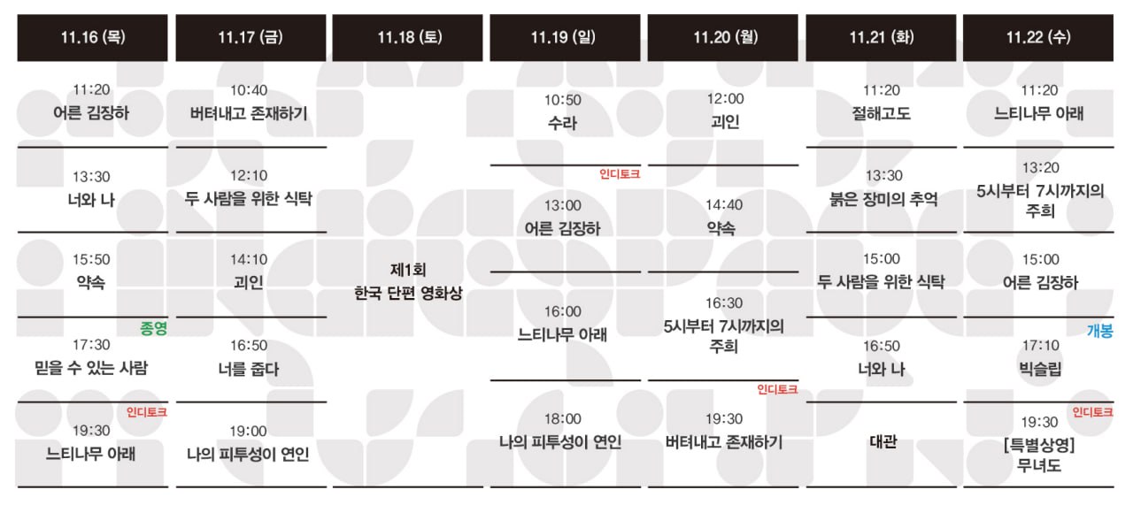 | [10.26-11.01 상영시간표] 두 사람을 위한 식탁 / 너와 나 / 우리의 하루 / 믿을 수 있는 사람 / 프리 철수 리 / 절해고도 / 킴스 비디오 (0) | 2023.10.19 |