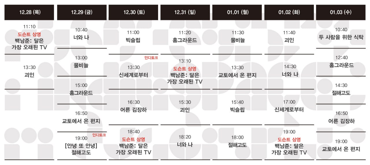 | 01.11-01.17 상영시간표 (0) | 2024.01.05 |