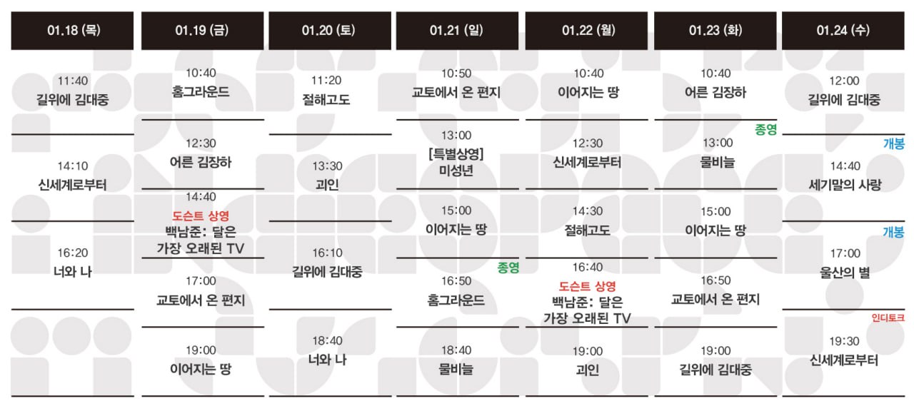 | 01.25-01.31 상영시간표 (0) | 2024.01.22 |