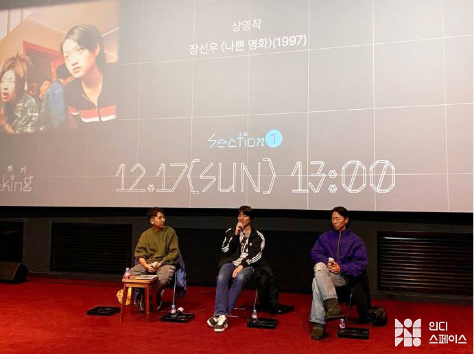 함연선: 오늘 〈나쁜 영화〉 보시고 이 자리에 계신 걸 텐데, 제가 〈나쁜 영화〉에 대한 설명을 조금 드리고 시작하려 해요. 중간에 나누고 싶은 질문이나 감상이 있다면 편하게 말씀해 주시면 좋을 것 같습니다. 〈나쁜 영화〉는 장선우 감독의 후기작이라고 할 수 있어요. 97년 8월 2일에 개봉을 했고, 서울 관객 14만 8천 명이었다고 해요. 그해 한국 영화에서 1·2위 흥행작이 〈편지〉와 〈접속〉이었는데요. 〈편지〉는 72만 명, 〈접속〉은 67만 명이었다고 하니까 어느정도 가늠이 되죠. 영화는 개봉 전후로 윤간 등의 묘사로 인해 공연윤리위원회와의 갈등으로 큰 논란이 되었다고 합니다. 평단이나 관객들 사이에서도 이 영화가 ‘나쁜’ 영화인지 아니면 ‘나쁜’ 좋은 영화인지에 대해서 논란이 있었다고 해요. 아마 오늘 영화를 보신 분들도 많은 생각을 하셨을 텐데, 특히 윤리적인 부분과 폭력적인 장면의 묘사에 관해서였을 것 같아요. 그런 부분들에 대해서도 이야기를 나누어 주시면 더 뜻깊은 자리가 될 것 같습니다. 저는 두 분께 〈나쁜 영화〉를 접하게 된 과정을 여쭤보고 싶어요. 먼저 말씀드리자면, 저는 장선우의 초기작인 〈성공시대〉나 〈우묵배미의 사랑〉을 좋아했었어요. 그런 영화가 재밌다고 하니까 친구들이 〈나쁜 영화〉가 찐이라는 거예요. 그래서 봐야겠다는 생각이 들었어요. 제가 유심히 보던 젊은 평론가나 예술가들이 2010년대 중반에 〈나쁜 영화〉를 계속 언급하더라고요. 그러다 2019년쯤에 학생들끼리 조그맣게 상영하는 장소에서 이 영화를 처음으로 봤어요. 두 분은 언제 어떻게 처음으로 보셨을까요?