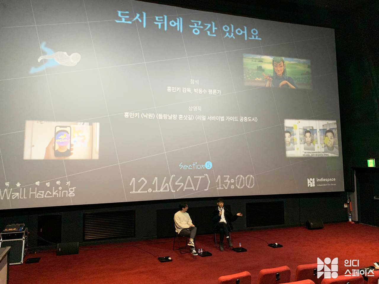 박동수 평론가(이하 박): 안녕하세요, 질문을 주고받기 전에 제가 이 기획전을 ‘도시 뒤에 공간 있어요’라는 제목으로 기획하게 된 이유를 짧게 얘기해 드리면 좋을 것 같습니다. 같이 기획해 주신 최이다 감독님께서 ‘벽을 해킹하기’라는 제목을 건네 주셨을 때 저는 바로 홍민키 감독님의 세 작품을 먼저 떠올렸었는데요. 올해 5월에 〈ACT!〉라는 웹진에서 퀴어 다큐멘터리스트 몇 분을 모아서 대담을 진행한 적이 있어요. 그때 홍민키 감독님도 함께해 주셨는데 개인의 육신이 놓이는 어떤 지지체로서의 공간을 역사화하고 기록하고 싶다고 말씀해 주신 게 있었거든요. 오늘 상영한 이 세 작품도 공간이라는 키워드가 굉장히 좀 강력하게 작동하고 있는 그런 작품들이에요.