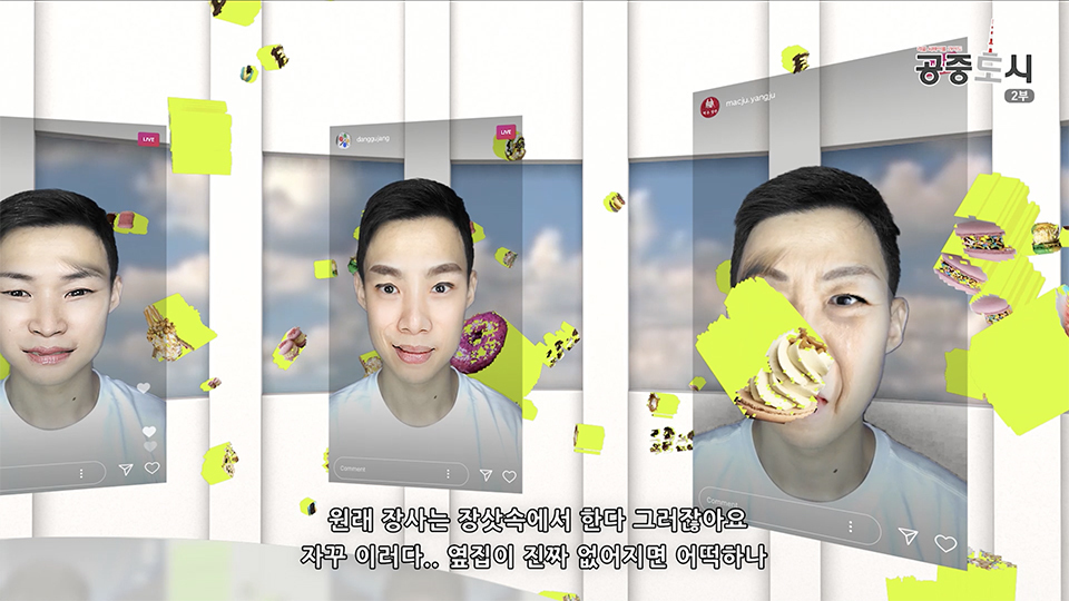 박동수: ‘공중도시 쇼’라는 이미지가 좀 독특하잖아요. 인스타그램 피드들이 마치 에반게리온에 나오는 것처럼 삥 둘러싸여 있고 그 와중에 말씀하신 대로 합성된 얼굴들이 있는데 그 얼굴들은 그러면 실제 상인 분들의 얼굴이긴 한 건가요?