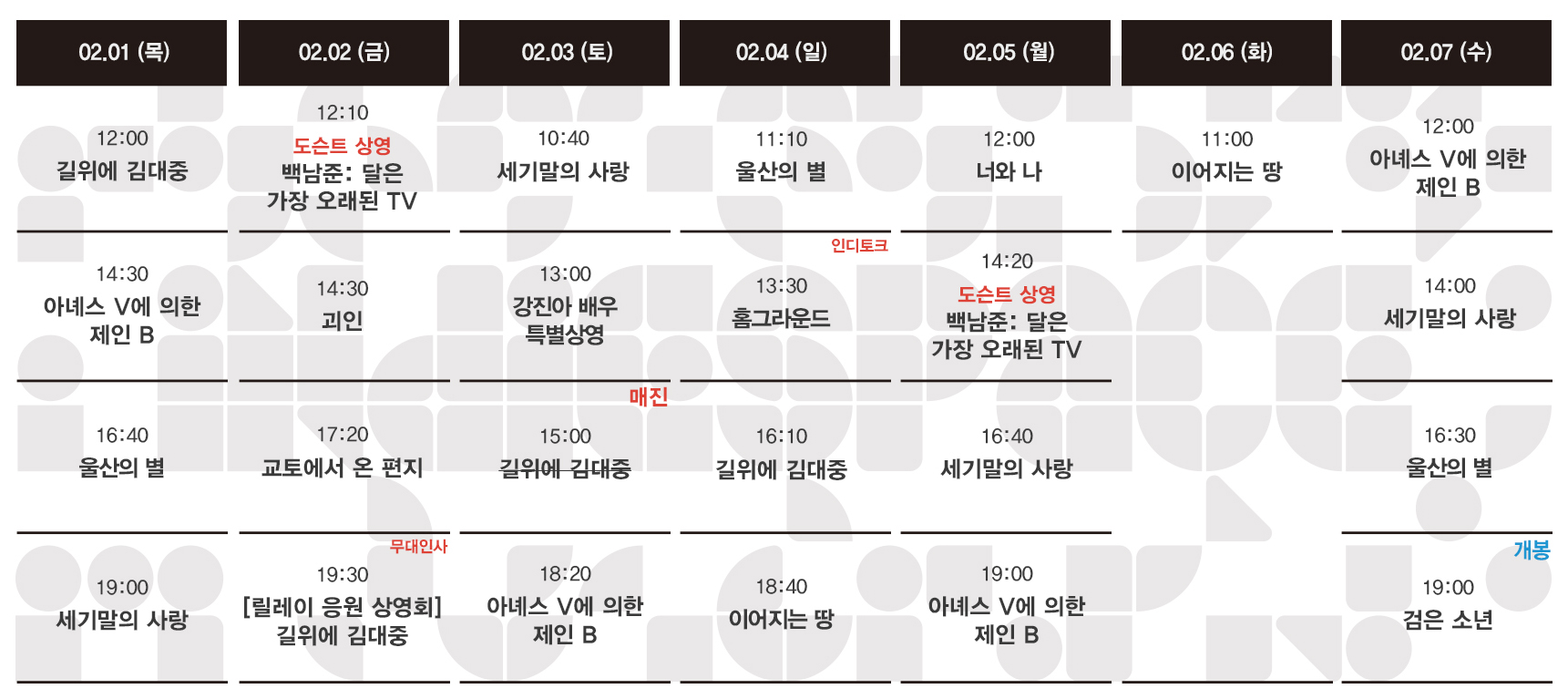 | 02.08-02.14 상영시간표 (0) | 2024.02.01 |