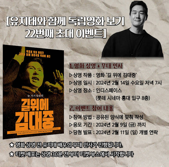 유지태 배우가 인디스페이스에서 <길위에 김대중> 티켓 100장을 구매하여 관객 여러분을 초대합니다.