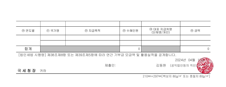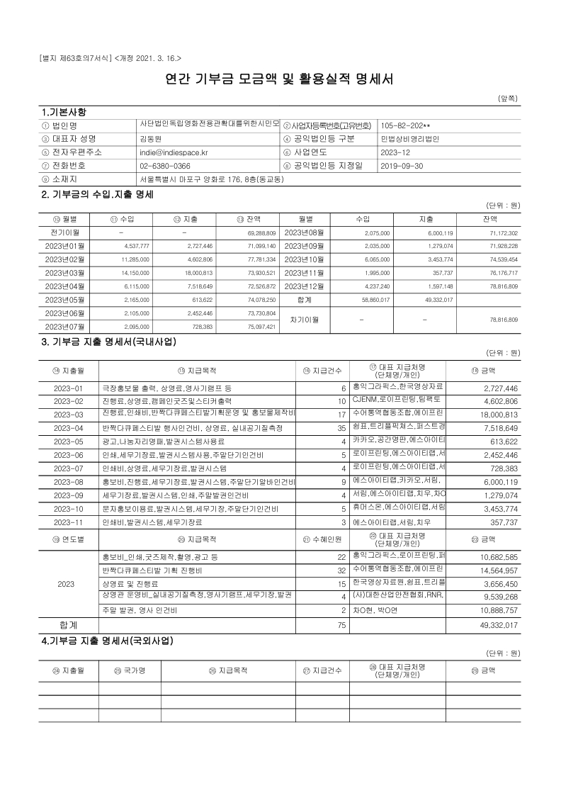 인디스페이스의 2023년 연간 기부금 모금액 및 활용실적 내역입니다.