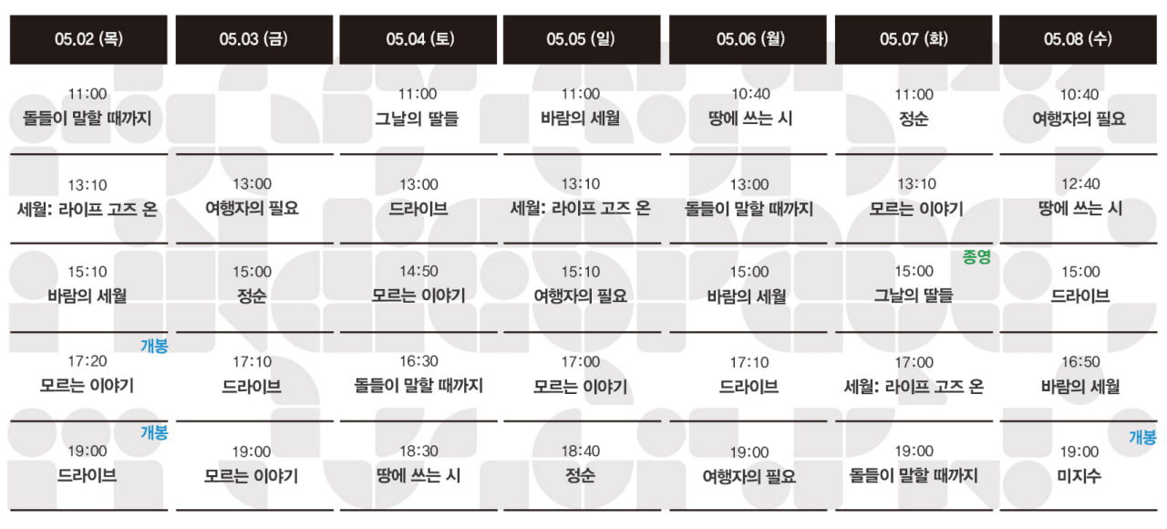 | 05.16-05.22 상영시간표 (0) | 2024.05.10 |