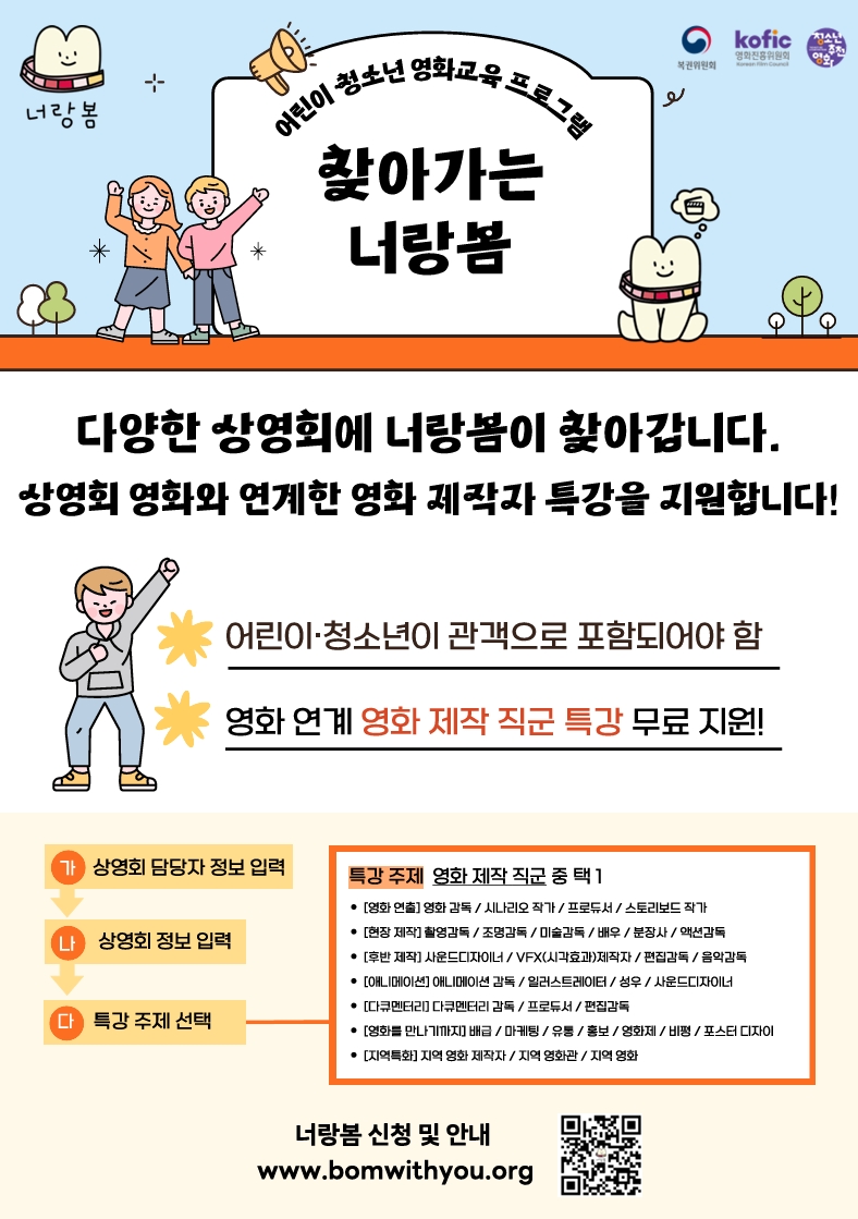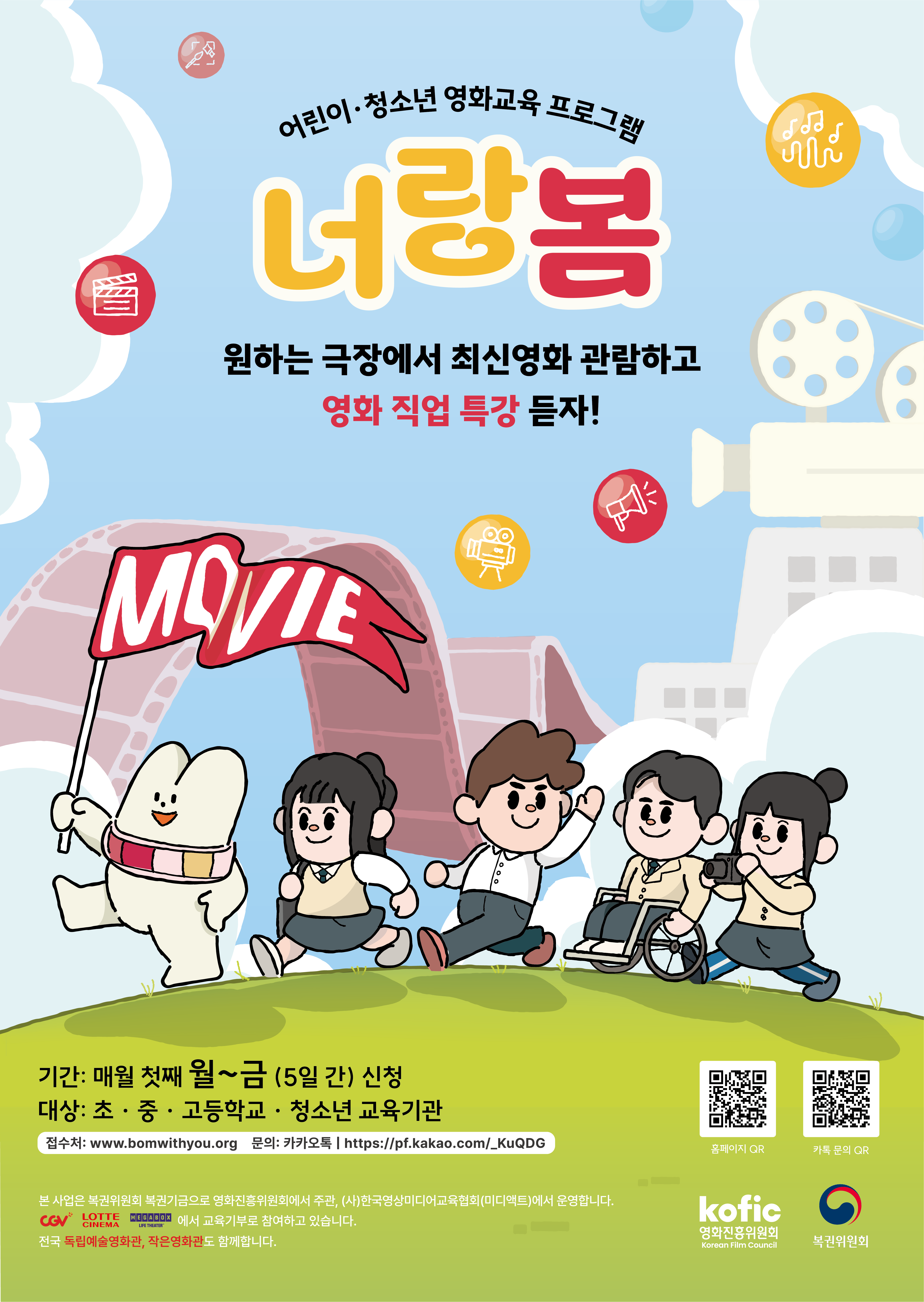 '너랑봄'은 어린이·청소년들이 영화의 문화적, 교육적 가치를 이해할 수 있도록, 희망하는 영화관 지점에서 영화 단체 관람과 함께 영화 연계 직업/소외계층 주제 특강이 진행되는 교육 프로그램입니다.