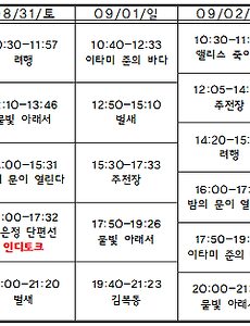 2019/08/224 <불빛 아래서> 상영일정·인디토크 _10월 24일 종영 상영일정 10월 21일(월) 12:5010월 24일(목) 19:30 종영 인디토크 예매하기 맥스무비 http://bit.ly/2vULqyh (좌석 선택 가능)예스24 http://bit.ly/an5zh9다음 http://bit.ly/2qtAcPS네이버 http://bit.ly/OVY1Mk 인디토크 인디토크● 일시: 2019년 10월 24일(목) 오후 7시 30분● 참석: 조이예환 감독 | 밴드 로큰롤라디오, 웨이스티드 쟈니스, 차세대 ● 일시: 2019년 8월 29일(목) 오후 7시 30분● 참석: 조이예환 감독, 신대철 기타리스트, 로큰롤라디오, 웨이스티드 쟈니스● 진행: 원승환 인디스페이스 관장 ● 일시: 2019년 9월 19일(목) 오후 7시 30분● 참석: 조이예환 감독 | 밴드 차세대 이찬희, .. 2019. 8. 22. [인디즈] 지금 해야 하는 가족 이야기 '인디포럼 월례비행' 〈이장〉 대담 기록 지금 해야 하는 가족 이야기 인디포럼 월례비행 〈이장〉 대담 기록 일시 2019년 7월 31일(수) 오후 7시 30분 상영 후참석 정승오 감독|배우 이선희, 공민정, 곽민규, 송희준진행 송효정 평론가 *관객기자단 [인디즈] 송은지 님의 글입니다. 가부장제 안에서 누군가는 권력을 누렸을 것이고, 누군가는 생존을 위해 안주하려 했을 것이고, 누군가는 삶을 통째로 희생당했을 것이다. 그러나 이들 중 그 누구도 자신의 의지로 가부장제 안으로 걸어들어온 사람은 없다. 영화 〈이장〉은 한편에선 페미니즘 이슈가 활발하고 다른 한편에선 아직까지도 가부장제가 죽지 않은 바로 지금 해야 하는 가족 이야기이다. 정승오 감독은 가족적 봉합 보다는 서로 어떻게든 공존하면서 이해하려 노력하는 지점이 중요하다고 말한다. 송효정 평.. 2019. 8. 22. <벌새> 상영일정·인디토크 _3월 31일 종영 상영일정 3월 23일(월) 16:403월 31일(화) 16:40 종영 예매하기 맥스무비 http://bit.ly/2vULqyh (좌석 선택 가능)예스24 http://bit.ly/an5zh9다음 http://bit.ly/2qtAcPS네이버 http://bit.ly/OVY1Mk 인디토크 인디토크● 일시: 2019년 11월 20일(수) 오후 7시● 참석: 김보라 감독● 진행: 손희정 평론가 ● 일시: 2019년 9월 8일(일) 오후 6시● 참석: 김보라 감독 | 배우 박지후, 김새벽, 이승연, 박서윤, 박수연● 진행: 이은선 영화저널리스트 ● 일시: 2019년 10월 3일(목) 오후 2시 30분● 참석: 김보라 감독 | 배우 김새벽 함께 인디토크● 일시: 2019년 9월 23일(월) 오후 8시 30분 - 상.. 2019. 8. 22. [08.29-09.04 상영시간표] 벌새 / 불빛 아래서 / 밤의 문이 열린다 / 이타미 준의 바다 / 려행 / 앨리스 죽이기 / 김복동 / 주전장 / 김군 2019. 8. 22. 이전 1 다음