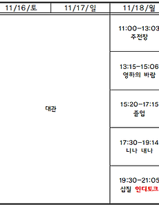 2019/11/082 <삽질> 상영일정·인디토크 _12월 11일 종영 상영일정 12월 7일(토) 11:0012월 9일(월) 15:4512월 10일(화) 11:0012월 11일(수) 14:30 종영 예매하기 맥스무비 http://bit.ly/2vULqyh (좌석 선택 가능)예스24 http://bit.ly/an5zh9다음 http://bit.ly/2qtAcPS네이버 http://bit.ly/OVY1Mk 인디토크 인디토크● 일시: 2019년 11월 18일(월) 오후 7시 30분● 참석: 김병기 감독, 안정호 오마이뉴스 기자● 진행: 장혜영 감독 ( 연출) INFORMATION 제목 삽질감독 김병기주연 이명박, 이재오, 김무성, 정종환, 이만의, 권도엽조연 심명필, 박석순, 신현석, 김철문 장르 대국민 뒤통수 프로젝트 추적 다큐멘터리상영시간 94분상영등급 12세이상관람가제작 오.. 2019. 11. 8. [11.14-11.20 상영시간표] 삽질 / 영하의 바람 / 졸업 / 니나 내나 / 오늘, 우리 / 메기 / 벌새 / 주전장 2019. 11. 8. 이전 1 다음