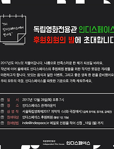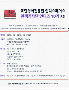 Community/알림395 [공지] 독립영화전용관 인디스페이스 관객기자단 인디즈 10기 모집 ▽ 인디즈 10기 지원서 다운로드 ▽ (manager@indiespace.kr 로 접수) 2018. 1. 20. [인디돌잔치] 2018년 1월 상영작을 선정해주세요 인디스페이스가 관객 여러분과 함께 마련하는 값진 상영회!개봉 1주년을 맞이하는 작품 중 다시 보고 싶은 영화를 투표로 선정해주세요.지난해에 아쉽게 놓친 작품이 있다면, 혹은 스크린을 통해 꼭 한번 다시 보고 싶은 작품이 있다면주저 말고 투표해주세요:-) 자, 2018년 1월의 '인디돌잔치'의 영광은 어떤 작품에게 돌아갈까요? (두근두근) >> 투표하러 가기 (클릭!) 2018. 1. 3. [공지] 독립영화전용관 인디스페이스 2017 기부금 영수증 발급 안내 2017. 12. 28. [12.28] 인디스페이스 후원회원의 밤에 초대합니다 2017. 12. 15. [인디돌잔치] 2017년 12월 상영작을 선정해주세요 인디스페이스가 관객 여러분과 함께 마련하는 값진 상영회!개봉 1주년을 맞이하는 작품 중 다시 보고 싶은 영화를 투표로 선정해주세요.지난해에 아쉽게 놓친 작품이 있다면, 혹은 스크린을 통해 꼭 한번 다시 보고 싶은 작품이 있다면주저 말고 투표해주세요:-) 자, 2017년 12월의 '인디돌잔치'의 영광은 어떤 작품에게 돌아갈까요? (두근두근) >> 투표하러 가기 (클릭!) 2017. 12. 6. [12.01-06] 서울독립영화제2017 서울독립영화제2017 http://www.siff.or.kr/ 개최일정 : 2017년 11월 30일(목) - 12월 08일(금)개최장소 : CGV아트하우스 압구정, 독립영화전용관 인디스페이스, 시네마테크전용관 서울아트시네마주최 : (사)한국독립영화협회, 영화진흥위원회주관 : 서울독립영화제2016 집행위원회 "MADE IN NOW" 지금이 아니면 안 될 것 같은 마음이우리를 지금 움직이게 합니다. 그런 ‘지금의 동력’이 오늘을 가능하게 한 것이 아닐까요? '지금'을 이야기하고 기억하는 것은지나간 시간을 마주하는 힘이자앞으로의 시간을 기대하는 원천이며무엇보다 현재를 통과하는 하나의 실천입니다. 독립영화의 오늘 또한 그렇습니다.시간이 과거에서 미래로 이어지듯어제의 영화들이 오늘의 영화를 만들었고,지금의 영화가.. 2017. 11. 23. [인디돌잔치] 2017년 11월 상영작을 선정해주세요 인디스페이스가 관객 여러분과 함께 마련하는 값진 상영회!개봉 1주년을 맞이하는 작품 중 다시 보고 싶은 영화를 투표로 선정해주세요.지난해에 아쉽게 놓친 작품이 있다면, 혹은 스크린을 통해 꼭 한번 다시 보고 싶은 작품이 있다면주저 말고 투표해주세요:-) 자, 2017년 11월의 '인디돌잔치'의 영광은 어떤 작품에게 돌아갈까요? (두근두근) >> 투표하러 가기 (클릭!) 2017. 11. 10. [인디돌잔치] 2017년 10월 상영작을 선정해주세요 인디스페이스가 관객 여러분과 함께 마련하는 값진 상영회!개봉 1주년을 맞이하는 작품 중 다시 보고 싶은 영화를 투표로 선정해주세요.지난해에 아쉽게 놓친 작품이 있다면, 혹은 스크린을 통해 꼭 한번 다시 보고 싶은 작품이 있다면주저 말고 투표해주세요:-) 자, 2017년 10월의 '인디돌잔치'의 영광은 어떤 작품에게 돌아갈까요? (두근두근) >> 투표하러 가기 (클릭!) 2017. 10. 11. [인디돌잔치] 2017년 9월 상영작을 선정해주세요 인디스페이스가 관객 여러분과 함께 마련하는 값진 상영회!개봉 1주년을 맞이하는 작품 중 다시 보고 싶은 영화를 투표로 선정해주세요.지난해에 아쉽게 놓친 작품이 있다면, 혹은 스크린을 통해 꼭 한번 다시 보고 싶은 작품이 있다면주저 말고 투표해주세요:-) 자, 2017년 9월의 '인디돌잔치'의 영광은 어떤 작품에게 돌아갈까요? (두근두근) >> 투표하러 가기 (클릭!) 2017. 9. 4. [09.04-30] 전시 '아갸미인디스페이스' 2017. 9. 4. [성명서] 문화체육관광부와 영화진흥위원회는 2017년 독립영화전용관 지원 사업을 전면 재검토하라! [성명서] 문화체육관광부와 영화진흥위원회는 2017년 독립영화전용관 지원 사업을 전면 재검토하라! 지난 6월말 문화체육관광부(이하 문체부)와 영화진흥위원회(이하 영진위)는 2018년 진흥사업 계획과 관련한 공청회를 진행했다. 공청회에 앞서 문체부와 영진위 직원들은 블랙리스트 사태에 대해 머리 숙여 사과했다. 너무 늦은 사과였지만 참석자들은 그나마 이 사과가 진정어린 것이길 바랐다. 하지만 이 날 발표된 사업 계획은 사과의 진정성을 의심하게 만들었다. 특히 독립영화전용관 지원 사업은 박근혜 정권 시절 만들어진 블랙리스트 정책이 그대로 유지되고 있어 매우 충격적이었다. 블랙리스트로 인해 실질적인 피해를 입은 사업 주체들이 사업의 문제점에 대해 꾸준히 문제를 제기했음에도 불구하고, 결국 현장의 목소리는 하나도.. 2017. 8. 30. [인디돌잔치] 2017년 8월 상영작을 선정해주세요 인디스페이스가 관객 여러분과 함께 마련하는 값진 상영회!개봉 1주년을 맞이하는 작품 중 다시 보고 싶은 영화를 투표로 선정해주세요.지난해에 아쉽게 놓친 작품이 있다면, 혹은 스크린을 통해 꼭 한번 다시 보고 싶은 작품이 있다면주저 말고 투표해주세요:-) 자, 2017년 6월의 '인디돌잔치'의 영광은 어떤 작품에게 돌아갈까요? (두근두근) >> 투표하러 가기 (클릭!) 2017. 8. 1. 이전 1 ··· 13 14 15 16 17 18 19 ··· 33 다음
