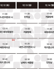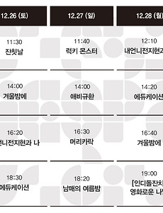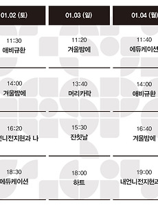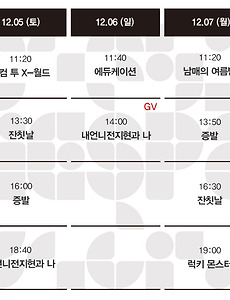 Now Playing/상영시간표729 [01.28-02.03 상영시간표] 나는 나를 해고하지 않는다 / 관계의 가나다에 있는 우리는 / 세자매 / 오늘, 우리2 / 요요현상 / 내언니전지현과 나 예매하기 예스24 http://bit.ly/an5zh9 네이버 http://bit.ly/OVY1Mk 작품정보 나는 나를 해고하지 않는다 관계의 가나다에 있는 우리는 세자매 오늘, 우리2 요요현상 내언니전지현과 나 2021. 1. 22. [01.21-01.27 상영시간표] 오늘, 우리2 / 요요현상 / 하트 / 족벌 두 신문 이야기 / 머리카락 / 겨울밤에 / 내언니전지현과 나 예매하기 예스24 http://bit.ly/an5zh9 네이버 http://bit.ly/OVY1Mk 2021. 1. 14. [01.14-01.20 상영시간표] 요요현상 / 하트 / 족벌 두 신문 이야기 / 머리카락 / 겨울밤에 / 잔칫날 / 에듀케이션 / 애비규환 예매하기 예스24 http://bit.ly/an5zh9 네이버 http://bit.ly/OVY1Mk 2021. 1. 7. [01.07-01.13 상영시간표] 하트 / 족벌 두 신문 이야기 / 머리카락 / 겨울밤에 / 잔칫날 / 에듀케이션 / 애비규환 예매하기 예스24 http://bit.ly/an5zh9 네이버 http://bit.ly/OVY1Mk 2021. 1. 4. [12.31-01.06 상영시간표] 하트 / 족벌 두 신문 이야기 / 머리카락 / 겨울밤에 / 잔칫날 / 에듀케이션 / 애비규환 / 남매의 여름밤 예매하기 예스24 http://bit.ly/an5zh9네이버 http://bit.ly/OVY1Mk 2020. 12. 28. [12.24-12.30 상영시간표] 머리카락 / 겨울밤에 / 잔칫날 / 럭키 몬스터 / 에듀케이션 / 애비규환 / 남매의 여름밤 예매하기 예스24 http://bit.ly/an5zh9네이버 http://bit.ly/OVY1Mk 2020. 12. 21. [12.17-12.23 상영시간표] 머리카락 / 겨울밤에 / 잔칫날 / 럭키 몬스터 / 에듀케이션 / 애비규환 / 남매의 여름밤 예매하기 예스24 http://bit.ly/an5zh9네이버 http://bit.ly/OVY1Mk 2020. 12. 14. [12.10-12.16 상영시간표] 겨울밤에 / 잔칫날 / 럭키 몬스터 / 에듀케이션 / 애비규환 / 남매의 여름밤 예매하기 예스24 http://bit.ly/an5zh9네이버 http://bit.ly/OVY1Mk 2020. 12. 3. [12.03-12.09 상영시간표] 잔칫날 / 럭키 몬스터 / 에듀케이션 / 증발 / 애비규환 / 웰컴 투 X-월드 / 남매의 여름밤 예매하기 예스24 http://bit.ly/an5zh9네이버 http://bit.ly/OVY1Mk 2020. 11. 27. [11.26-12.02 상영시간표] 에듀케이션 / 증발 / 애비규환 / 황무지 5월의 고해 / 웰컴 투 X-월드 / 담쟁이 / 디어 마이 지니어스 / 남매의 여름밤 예매하기 예스24 http://bit.ly/an5zh9네이버 http://bit.ly/OVY1Mk 2020. 11. 20. [11.19-11.25 상영시간표] 증발 / 애비규환 / 황무지 5월의 고해 / 웰컴 투 X-월드 / 담쟁이 / 젊은이의 양지 / 디어 마이 지니어스 / 남매의 여름밤 예매하기 예스24 http://bit.ly/an5zh9네이버 http://bit.ly/OVY1Mk 2020. 11. 12. [11.12-11.18 상영시간표] 증발 / 애비규환 / 황무지 5월의 고해 / 웰컴 투 X-월드 / 담쟁이 / 젊은이의 양지 / 디어 마이 지니어스 / 남매의 여름밤 예매하기 예스24 http://bit.ly/an5zh9네이버 http://bit.ly/OVY1Mk 2020. 11. 4. 이전 1 ··· 18 19 20 21 22 23 24 ··· 61 다음