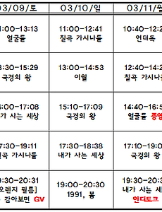 Now Playing/상영시간표730 [04.04-04.10 상영시간표] 한강에게 / 파도치는 땅 / 선희와 슬기 / 히치하이크 / 내가 사는 세상 / 칠곡 가시나들 / 국경의 왕 2019. 3. 28. [03.28-04.03 상영시간표] 선희와 슬기 / 히치하이크 / 내가 사는 세상 / 칠곡 가시나들 / 국경의 왕 / 1991, 봄 2019. 3. 22. [03.21-03.27 상영시간표] 선희와 슬기 / 히치하이크 / 내가 사는 세상 / 칠곡 가시나들 / 국경의 왕 / 1991, 봄 2019. 3. 15. [03.14-03.20 상영시간표] 히치하이크 / 내가 사는 세상 / 칠곡 가시나들 / 언더독 / 국경의 왕 / 1991, 봄 2019. 3. 7. [03.07-03.13 상영시간표] 내가 사는 세상 / 칠곡 가시나들 / 언더독 / 국경의 왕 / 이월 / 얼굴들 / 1991, 봄 2019. 2. 28. [02.28-03.06 상영시간표] 내가 사는 세상 / 칠곡 가시나들 / 언더독 / 이월 / 얼굴들 / 1991, 봄 2019. 2. 22. [02.21-02.27 상영시간표] 언더독 / 이월 / 얼굴들 / 메이트 / 버블 패밀리 / 어른이 되면 / 1991, 봄 2019. 2. 18. [02.14-02.20 상영시간표] 이월 / 얼굴들 / 메이트 / 버블 패밀리 / 어른이 되면 / 1991, 봄 2019. 2. 7. [02.07-02.13 상영시간표] 이월 / 얼굴들 / 메이트 / 버블 패밀리 / 어른이 되면 / 1991, 봄 2019. 1. 31. [01.31-02.06 상영시간표] 이월 / 얼굴들 / 메이트 / 버블 패밀리 / 어른이 되면 / 1991, 봄 2019. 1. 25. [01.24-01.30 상영시간표] 얼굴들 / 메이트 / 버블 패밀리 / 어른이 되면 / 1991, 봄 2019. 1. 17. [01.17-01.23 상영시간표] 메이트 / 버블 패밀리 / 어른이 되면 / 영주 / 1991, 봄 2019. 1. 10. 이전 1 ··· 26 27 28 29 30 31 32 ··· 61 다음